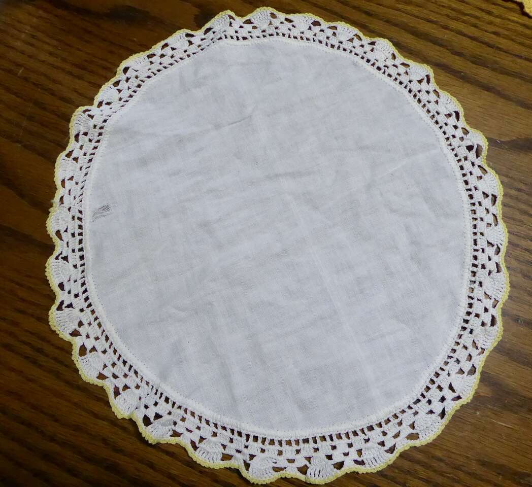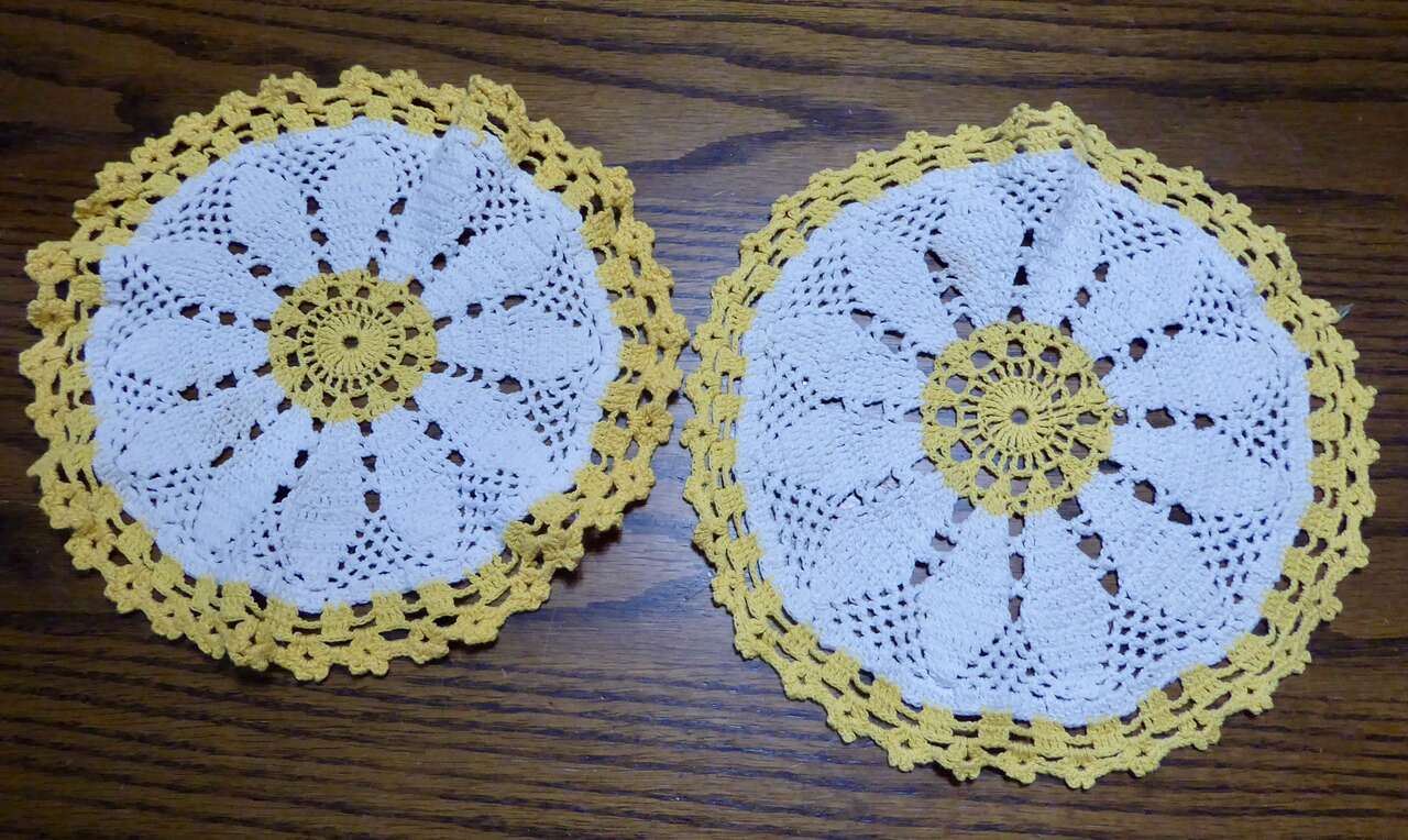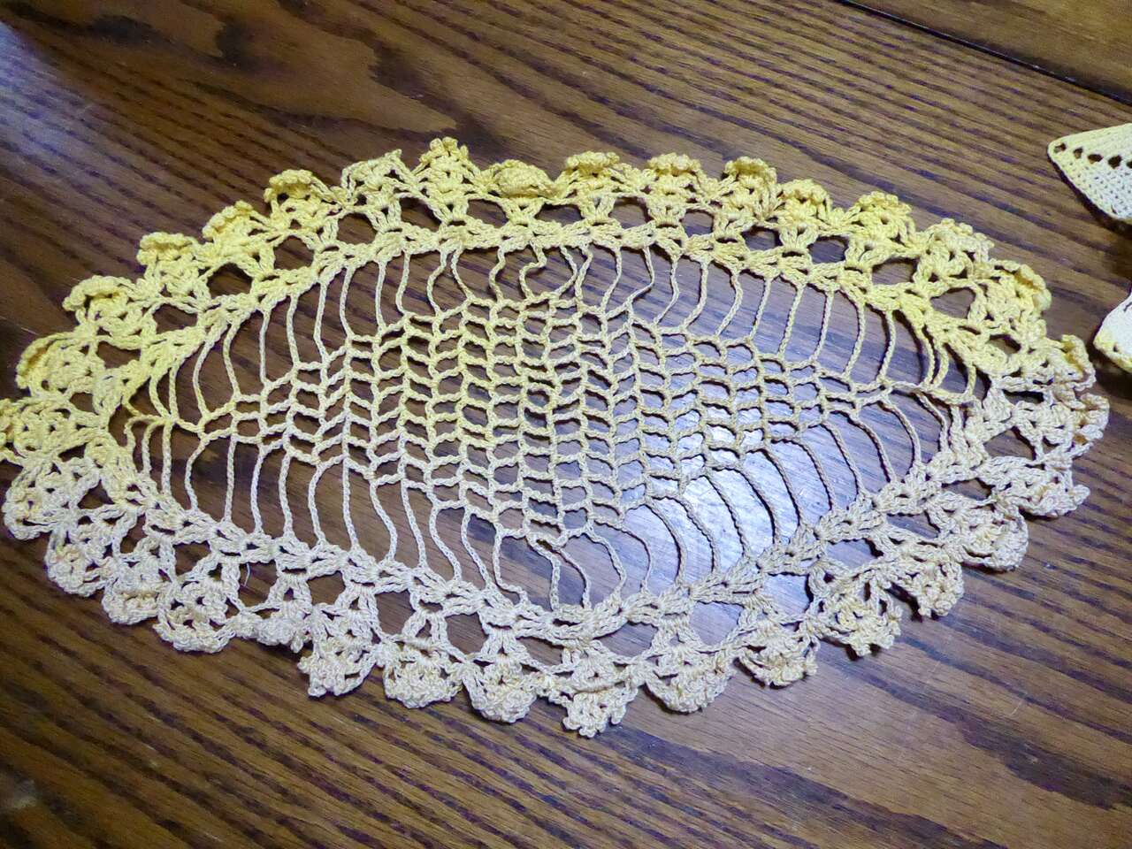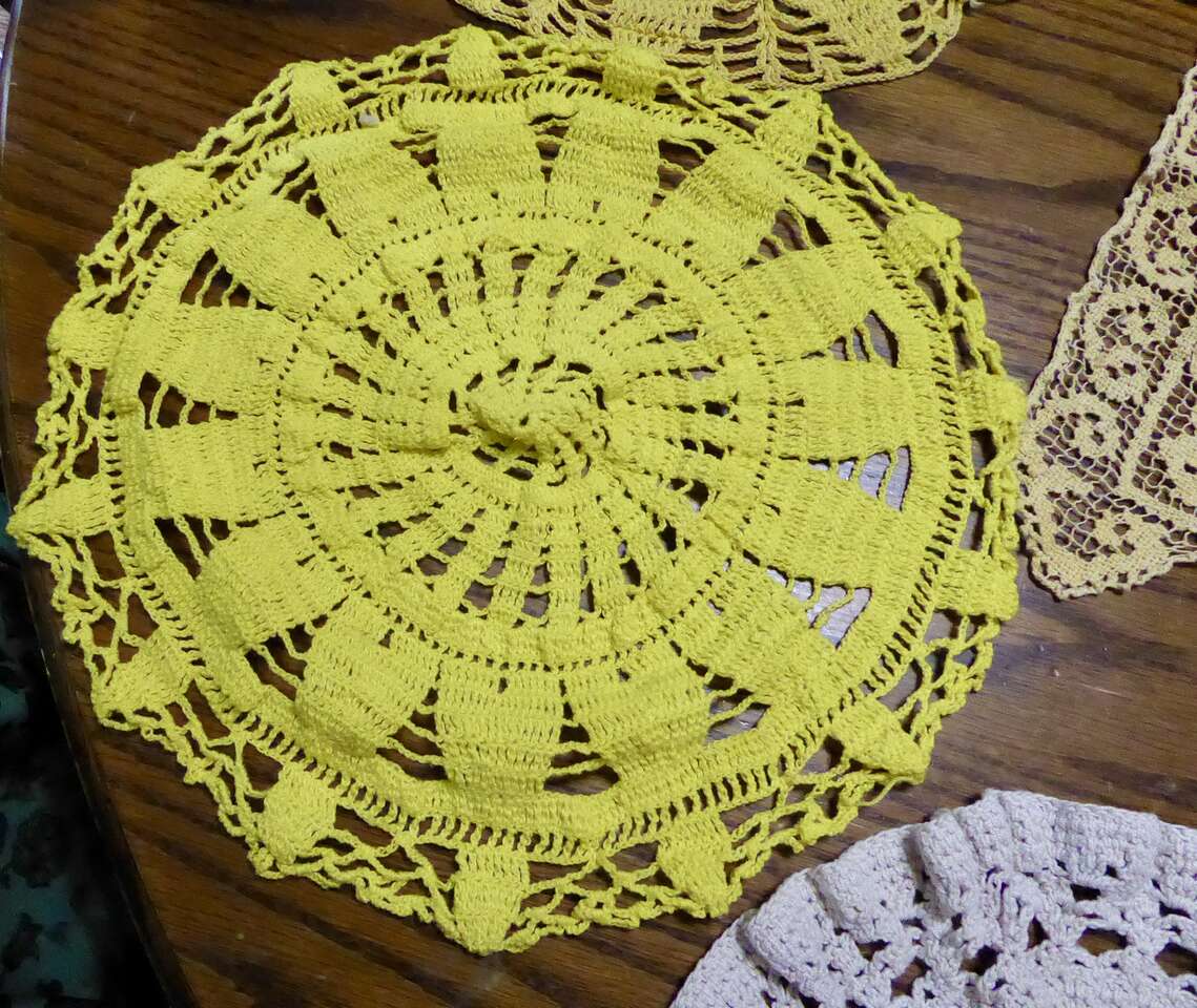Please Note… there are a few that have been by accidentely bleached by the sun so they got sun-bleached and discolored but they could be re- dyed to any color of your choice or back to their original yellow- whatever you decide is great! We will discount these pretty doilies if you would like them at a good price for you.