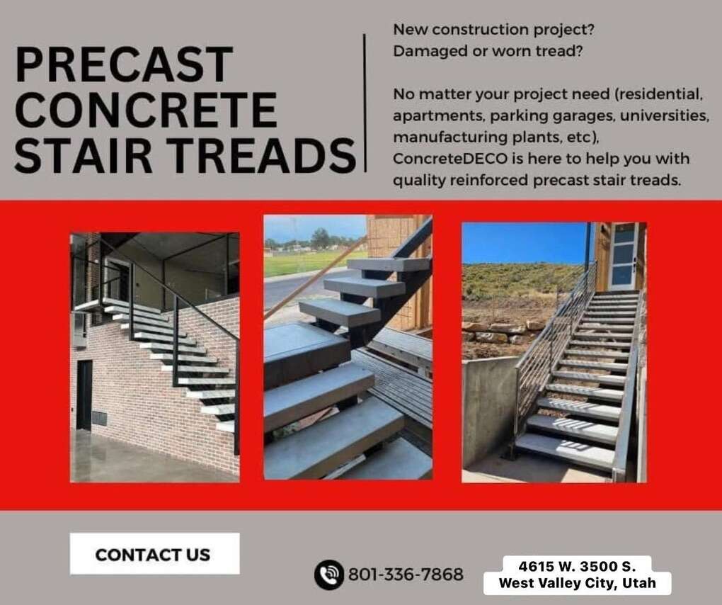 Concrete DECO is here to help you with quality reinforced stair treads. Treads are made to size for your concrete stair project.