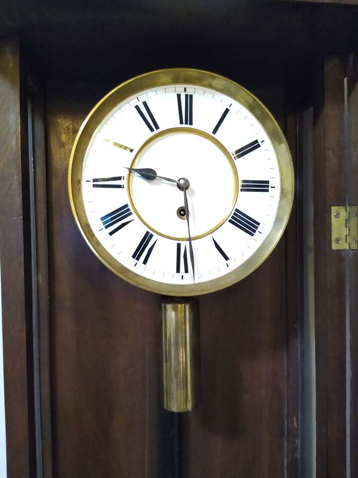 The antique French wall wood clock of the late 19th century and the early 20th century, all original. Very good condition.