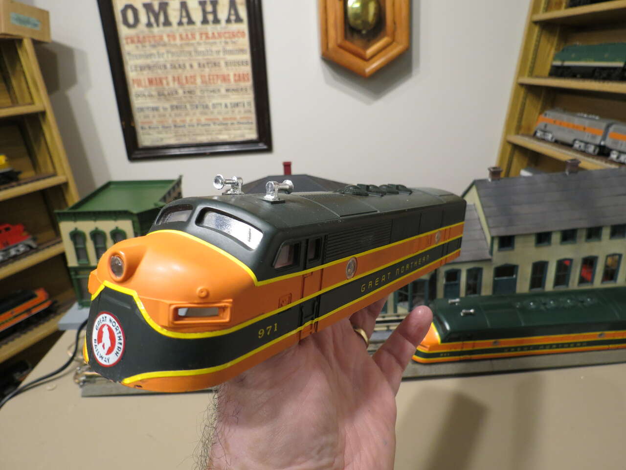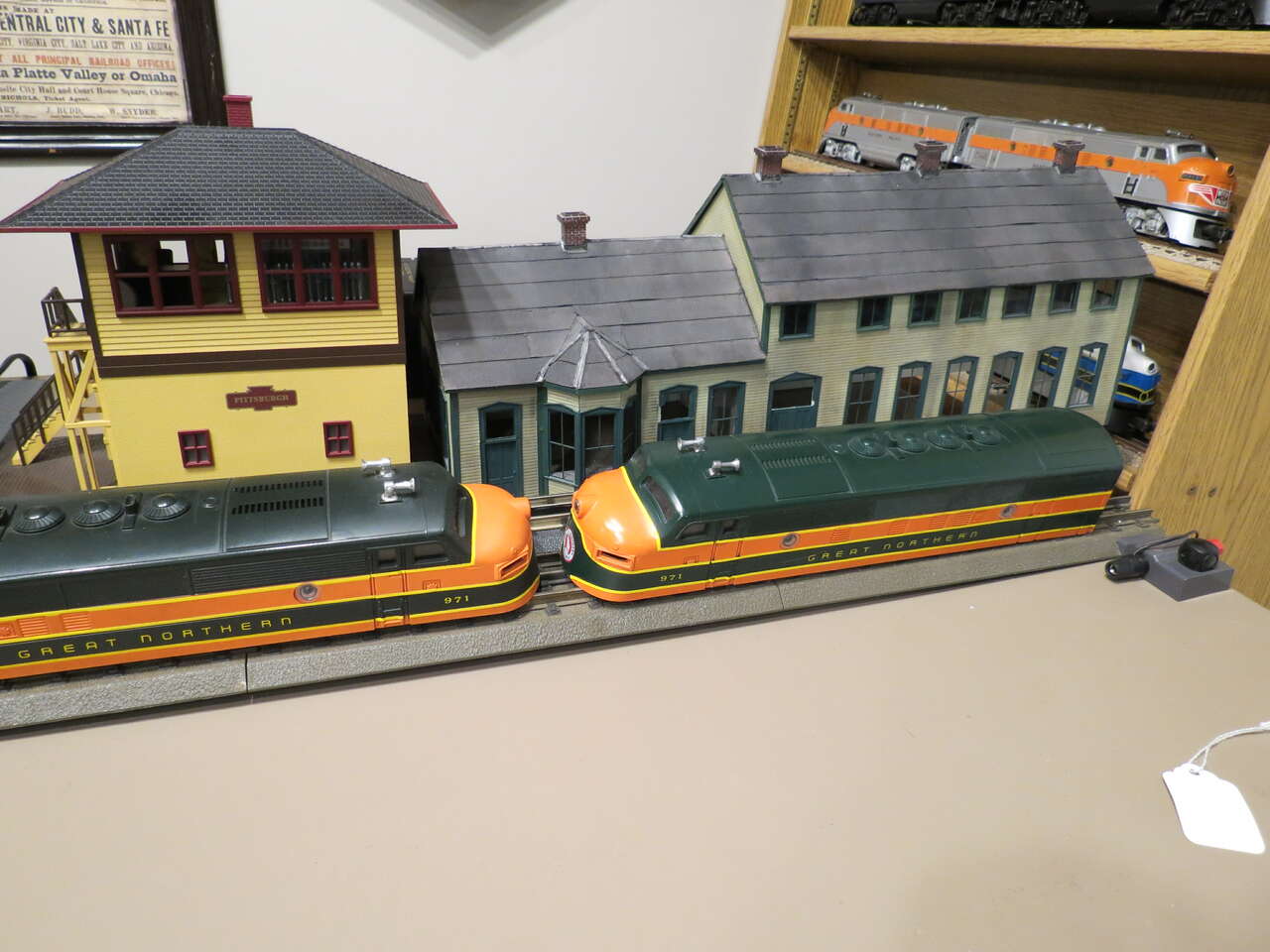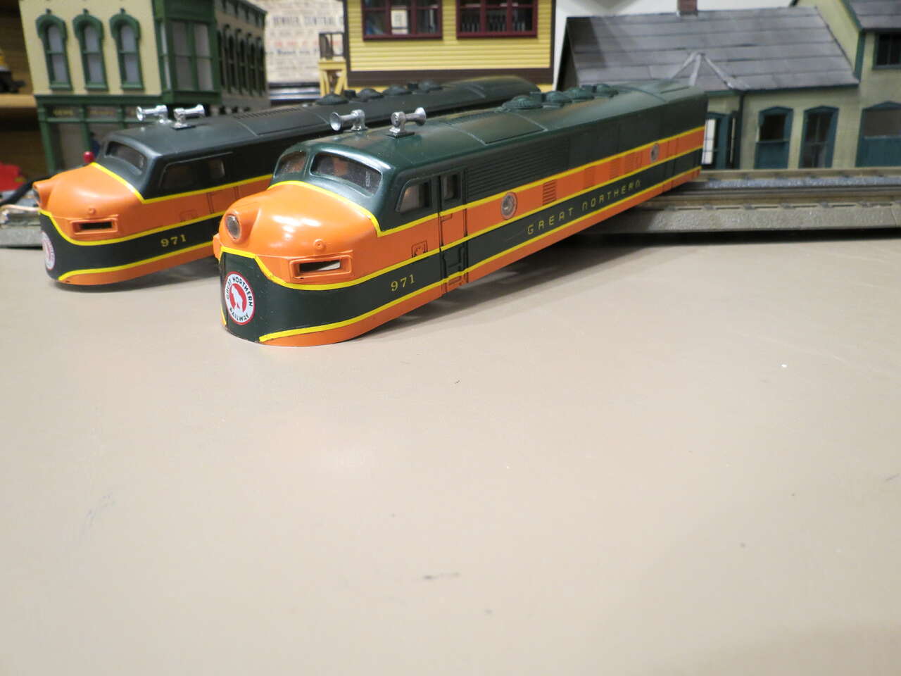 Lionel Postwar Style F-3 Great Northern Diesel Bodies. 1 pair Custom painted with body mounting rear clips already installed, horns, windshields, and side porthole windows included. No plastic number boards-available from toy train parts retailers cheap..(i.e. eastcoasttrainparts.com). Ready to mount to your postwar or modern MPC F-3 metal chassis. Background items/buildings are not included in this sale.