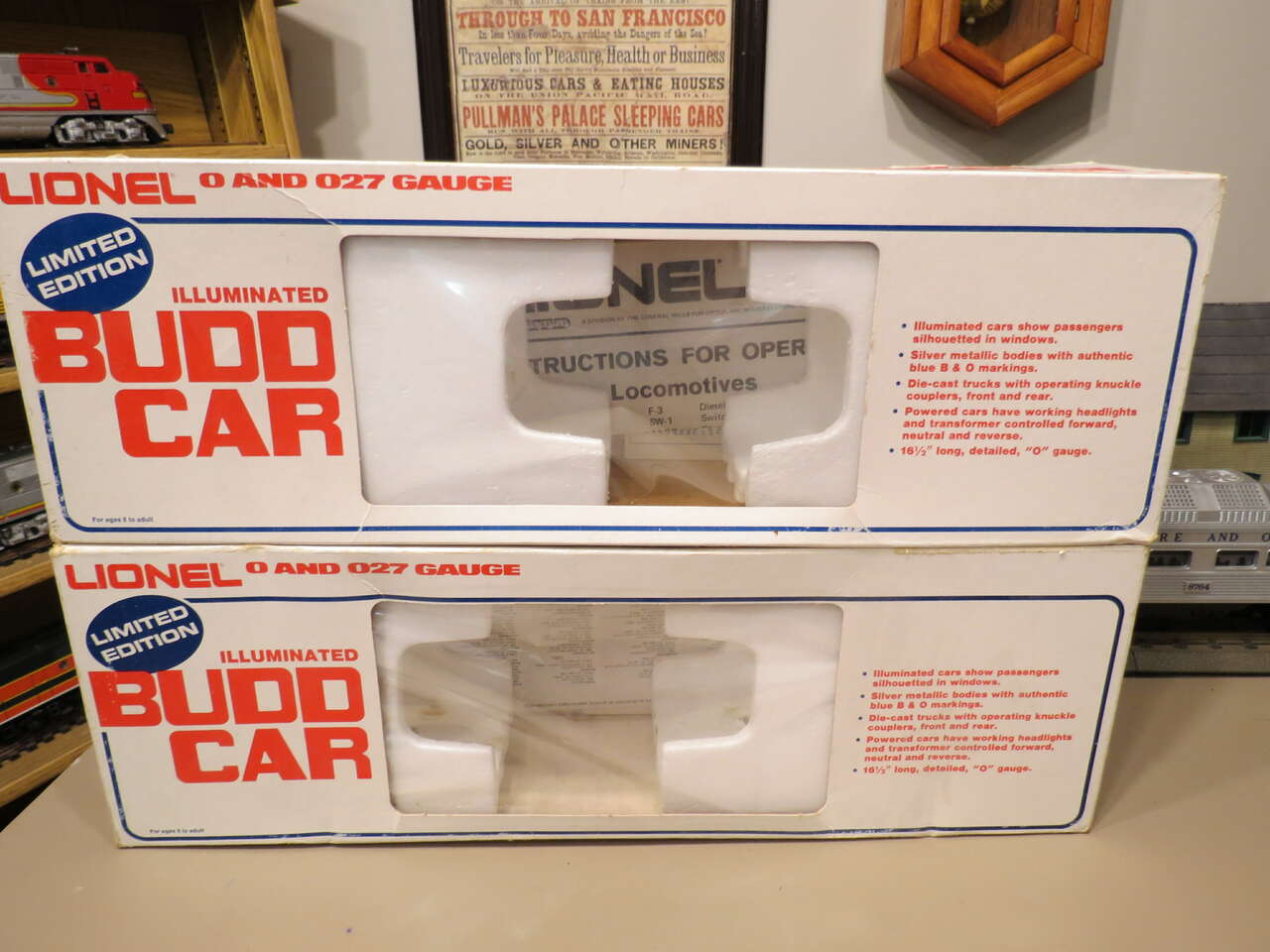 Lionel Trains 2 car B&O Budd diesel Commuter Car Set. Catalogued 1977. This is the companion set to the 3 car Service Station Special set. The commuter car is powered- the baggage is not- opposite of the SS Set which has the baggage powered. All are illuminated. So you have the potential for a 5 car commuter train if you purchased both sets. Background items are not included in this sale.