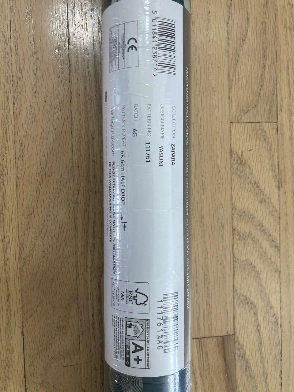 VenmoDesigner double roll of wallpaper, about 74 square feet. Roll is 27" wide x 32.962 length, There is a pattern so will not cover 74 square feet. Harlequin brand, from Zapara collection, design name Yasuni #11761. Please google to see pictures of this hanging. It is very expensive so you want to make sure will cover area. Would be great for small bathroom wall or end of a hallway. The label does not say pre-pasted, would probably need clear wall covering adhesive if using for actually wall covering. (new lowered price $60)