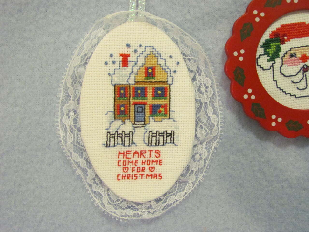 Handmade Cross-stitch Christmas Ornaments "Hearts Come Home For Christmas" Santa - New