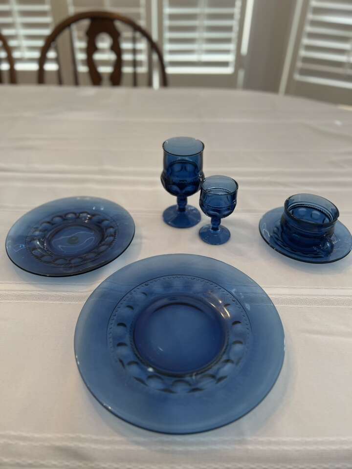 Beautiful imperial Blue Dinnerware! Excellent condition! Never used! Collection consists of the following: 25 Dinner Plates 23 Large Goblets 25 Dessert Plates 16 Small Goblets 24 Tea/Coffee Cups 25 Saucers Large Serving Bowl