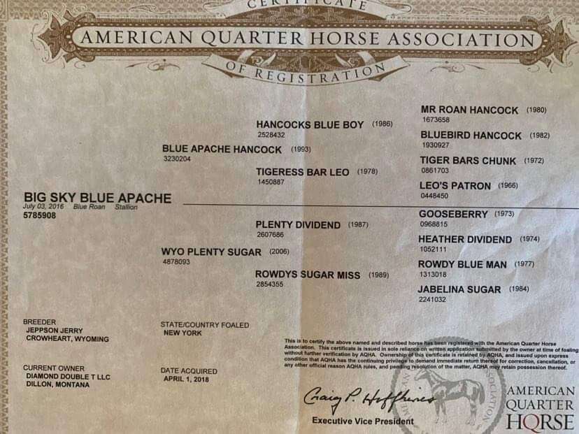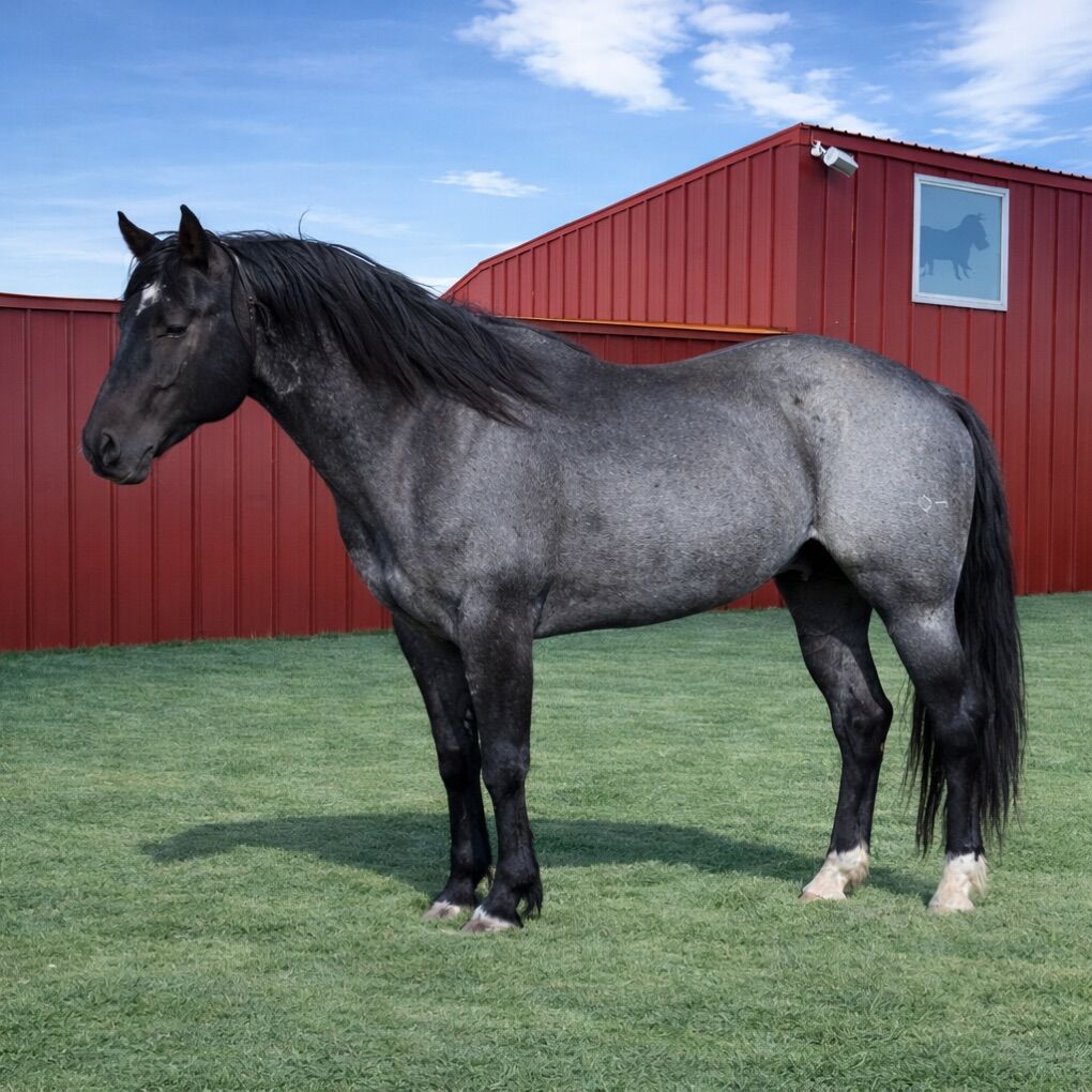 BIG SKY BLUE APACHE is not just another stallion standing for the season—he is a genetic phenom for breeders who understand size, bone, substance, and ranch heartiness. Standing for 2026 at SK Ranch, Apache is a massive 16.1 HAND, 1,400 LB TRUE HOMOZYGOUS BLACK BLUE ROAN STALLION, built with bone, power, and undeniable presence that immediately separates him from the average stallion market. His pedigree is deeply rooted in real-world ranch performance, stacking legendary bloodlines including JOE HANCOCK, BLUE VALENTINE, GOOSEBERRY, MR ROAN HANCOCK, AND ROWDY BLUE MAN, making him a stallion designed for durability, brains, and work ethic—not just color. This is the kind of genetic profile that consistently produces ranch horses with longevity, mind, and resale strength, positioning Apache progeny as high-value colts.