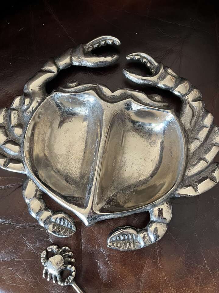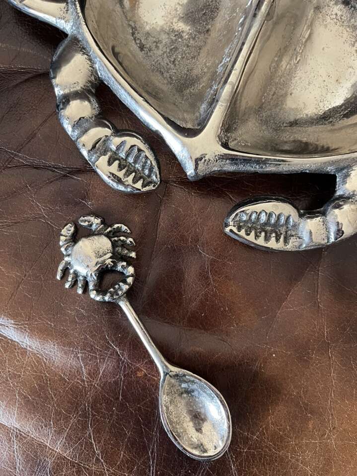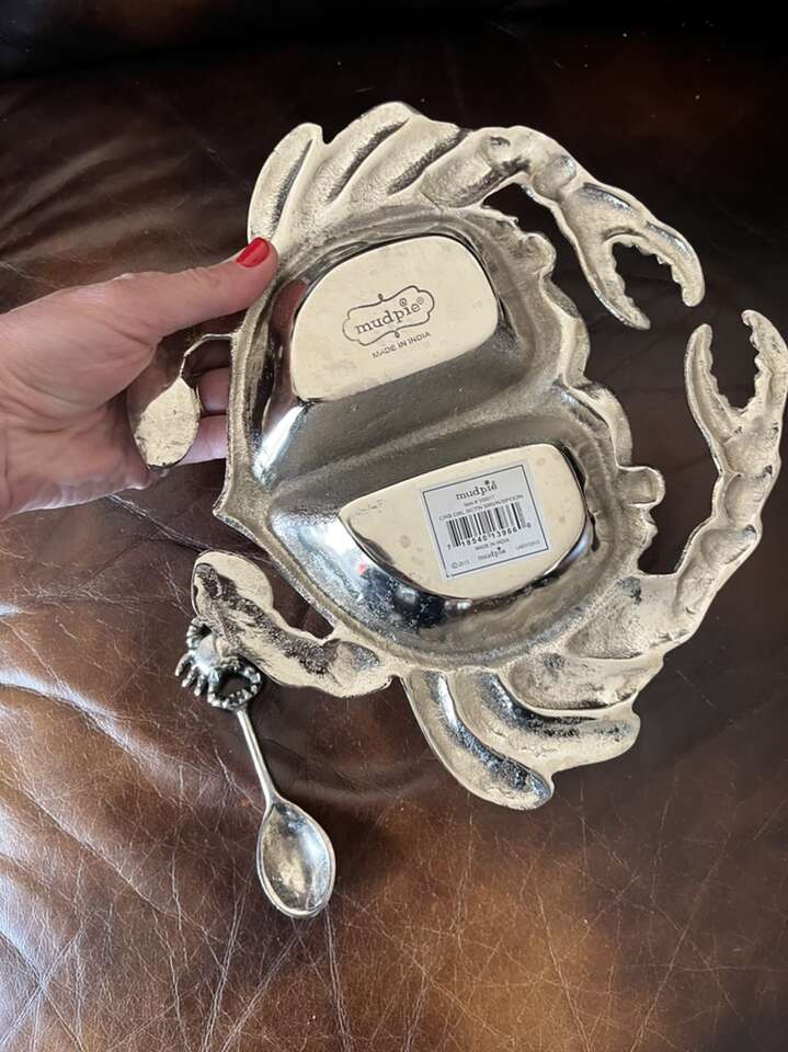 Crab serving with spoon dish silver in color 10 x 9 1/2