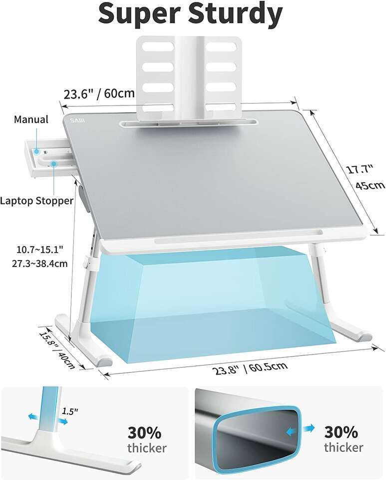 About this item [ADJUSTABLE LAPTOP TABLE]: The adjustable angles and heights allow you to customize the tray to be ergonomically friendly, saving strain on your eyes, back and neck, Two auto-lock buttons on each side can make the quick change in height easily, and table legs can be set to 5 different heights (adjustable from 10.6" - 15.4"). two clamps can be used to adjust the surface angle, the surface can be set to 4 different angles (from 0°-36°). [XXL EXTRA LARGE]: The 23.6" x 17.7" extra large laptop lap desk will fit all you need. keep your laptop, textbook, mouse, and smartphone all within easy reach. It's wide enough to be comfortable working on a couch, on a bed, standing at a table, or even on the floor. the legs are 30 percent thicker than most bed desk legs for extra stability. At the same time, it has enough leg room to cross your legs. supports up to 88 lb load bearing. [MULTIFUNCTION PORTABLE LAPTOP DESK]: With non-slip leather desktop, a storage drawer, a removable book stand, a moveable laptop stopper, Notebook slip,easy-glide sled legs, foldable design, and excellent build quality. [MULTIPLE USAGE BED TABLE TRAY]: This multifunctional table will be a perfect addition to your office, Ideal college dorm room essentials for girls/boys, home essentials, home office accessories for study, writing, working, reading! Use it as a laptop workstation, laptop stand for bed, a children's bed table, a mini writing table, laptop couch table, and a standing table for office work, a lap desk for kids. it becomes a great balance for relaxation and productivity.