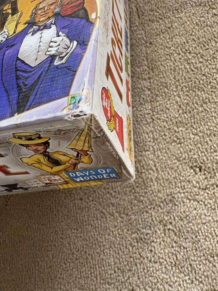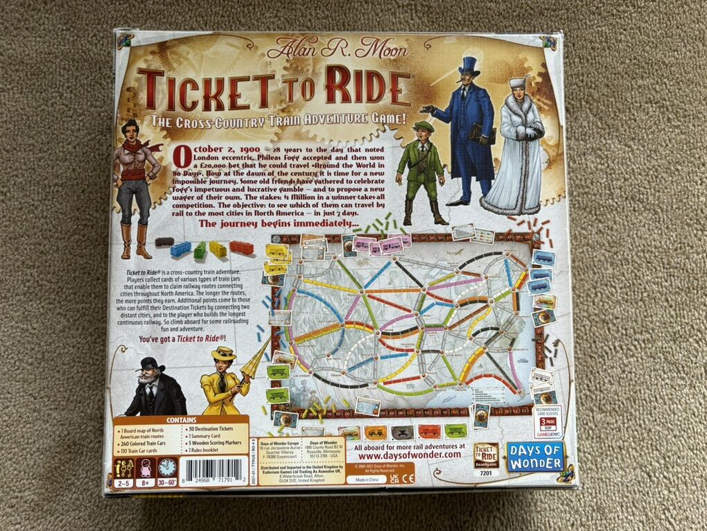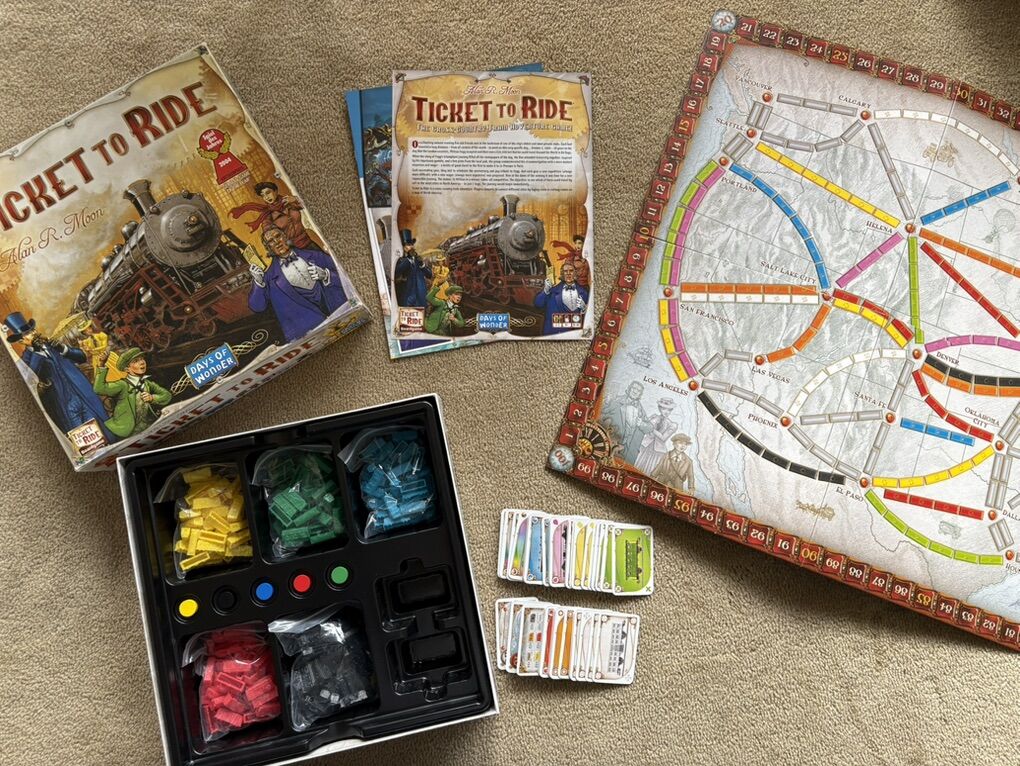 COMPLETE Ticket to Ride: Days of Wonder Board Game. High quality, fun cross-country train adventure game. 2019, by Alan R. Moon. Complete, no pieces missing. Components in excellent condition. Box corners slightly bumped (see photos). Text only. Cash or Venmo.