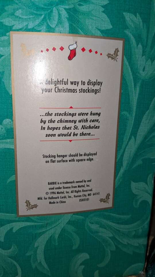 Hallmark Holiday Barbie Christmas Stocking Hanger w/ Original Box 1996 NEW.
