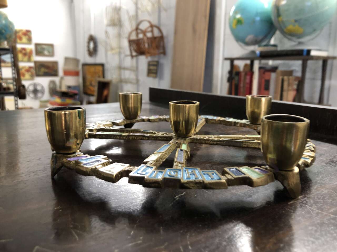 Vintage Mid Century Modern ”In the night light shines” brass candelabra holder - made in Israel. TERRA SANCTA GUILD. Quote says: In The Night Light Shines Advent 5 Candle 8” Holder Israel. I have a bunch of great MCM candle holders
