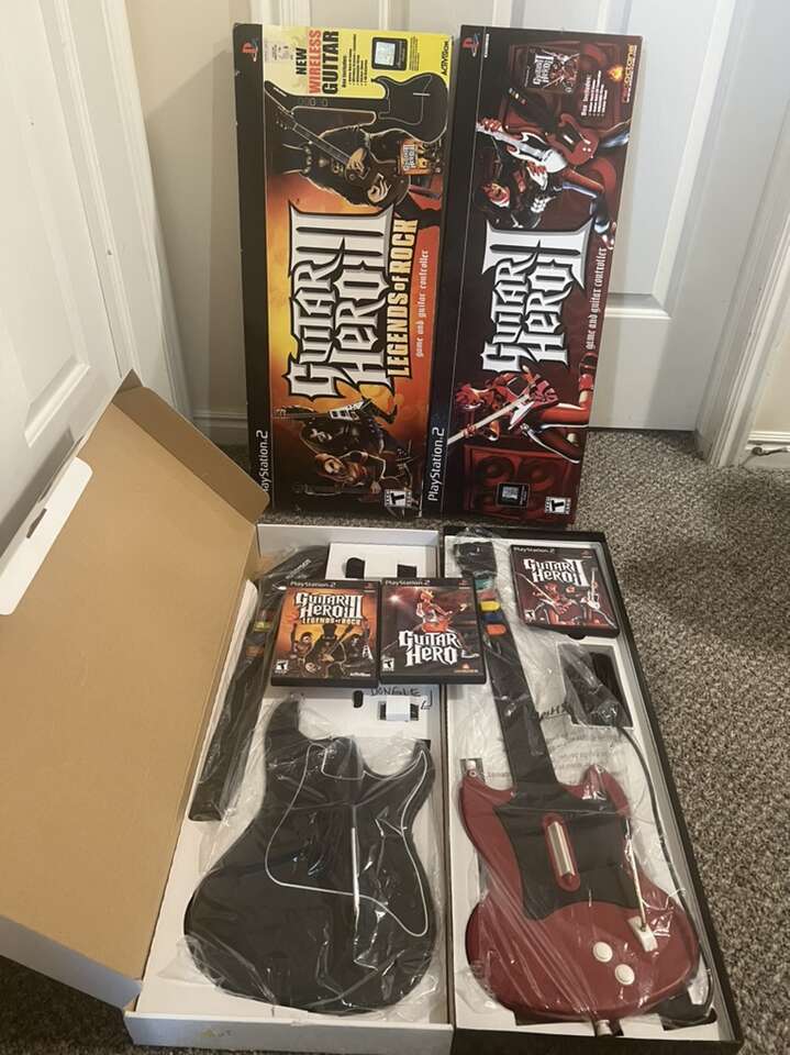 Bundle 1 (first two pictures) includes a wired guitar, wireless guitar, still in their boxes, both still practically new(dongle and shoulder straps are included) and 3 Guitar Hero games $360
