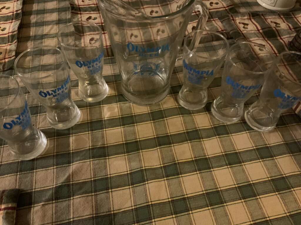 Vintage in perfect condition Rare Olympia beer wildlife series Moose-cougar-antelope-ram And Olympia beer pitcher with 6 glasses Can be delivered to Utah county