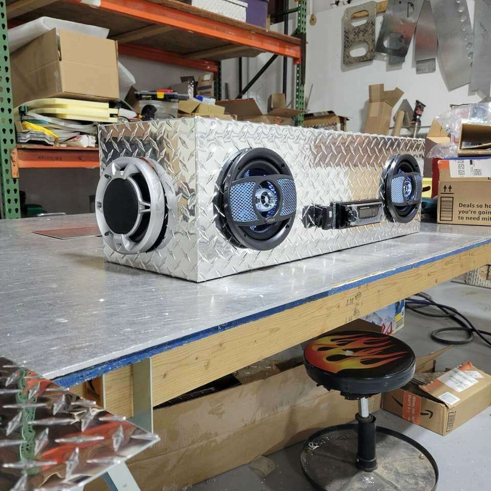 Full diamond plate enclosure set up for your stereo to self install or sold as a drop in kit. Custom sizes and designs available Pick up in Ogden, Utah