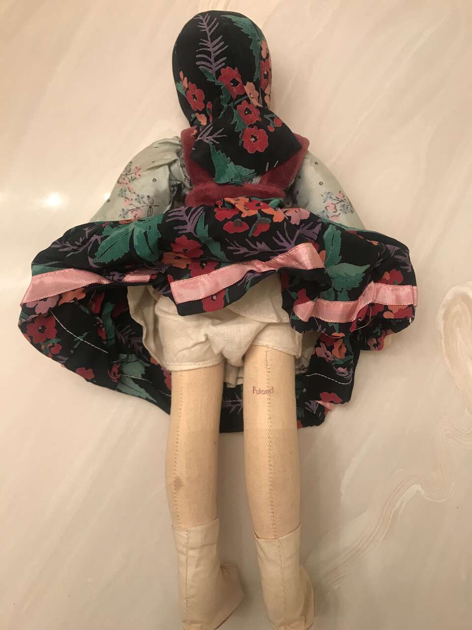 Rag Doll Poland Red velvet cloth body Dress Head Scarf Floral 15" hinged figure