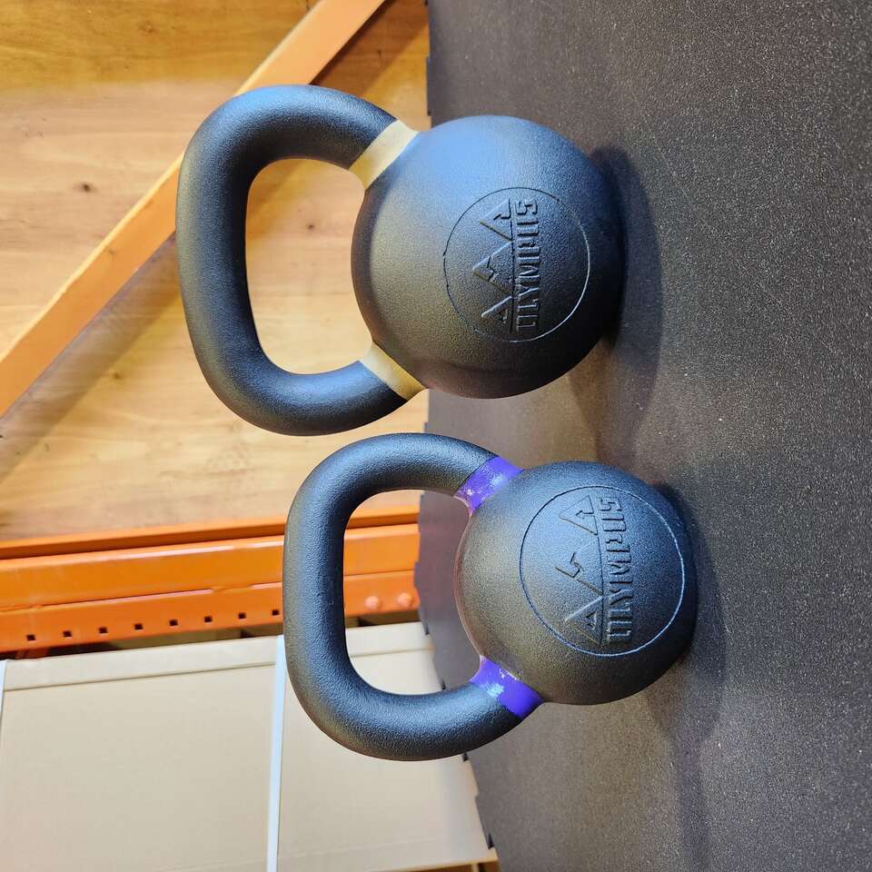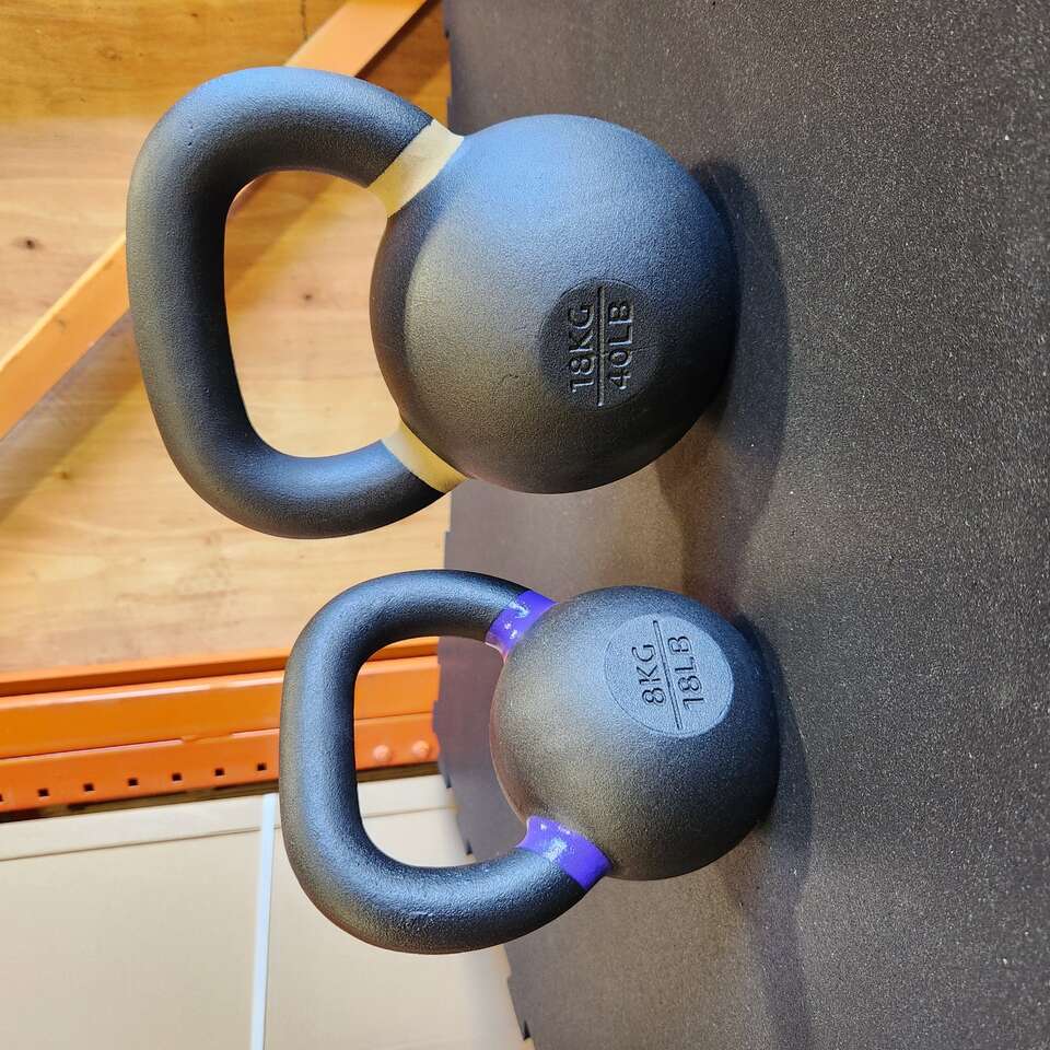 Shown here are a 8 Kilogram and 18 Kilogram Kettlebell (equivalent to 18 and 40 pounds). If you're new to using kettlebells these sizes work great for a variety of different exercises and movement patterns. Purchase them together for only $110, available for immediate pickup at our new showroom in Midvale.