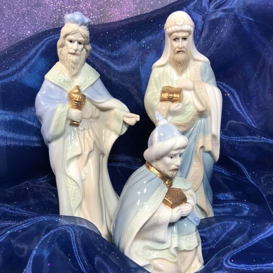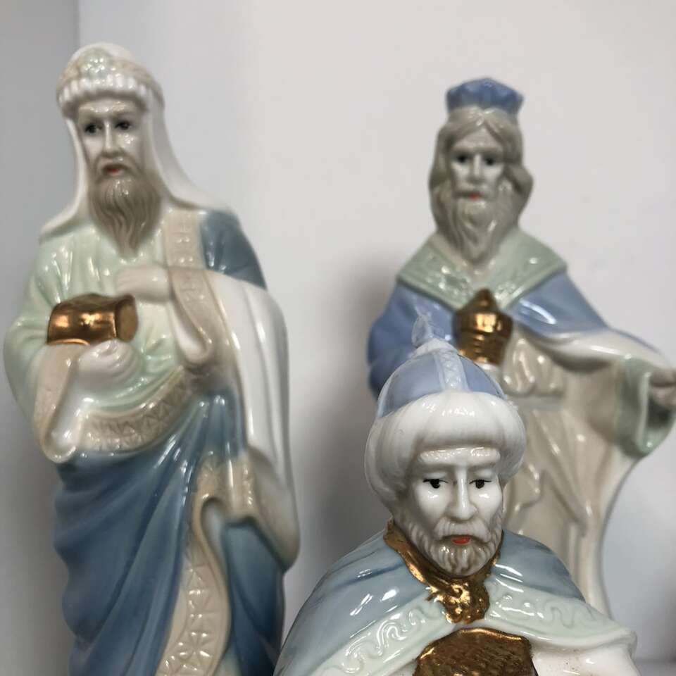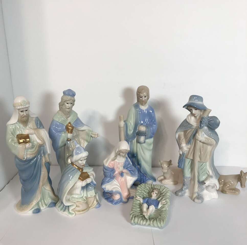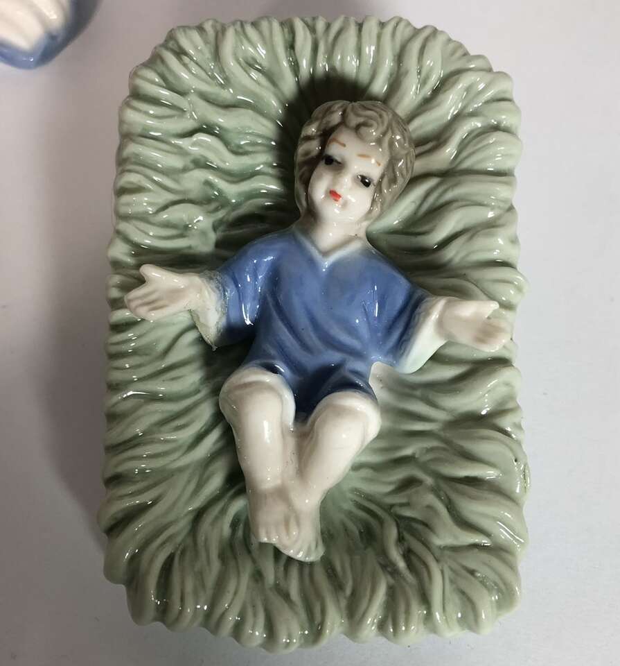 Gently used 1960’s -1970’s Vintage Ceramic Nativity Set is based on calm and serene pastel Blue & Green with additional accent colors, such as Pink on Mother Mary. Other accent colors are softer. Your grandparents probably had this set. This is the smaller version of this traditional set: tallest pieces are 7.75” tall. 10 piece set: 3 members of Holy family, 3 wise men, one shepherd, one sheep, and 2 stable animals. Smoke free. No chips, cracks, or defects. Double boxed for shipping- weighs 7 pounds- I pay the extra shipping- you pay only 7.67 for 3 day shipping. Comes in hinged cardboard box- not original but perfect for permanent storage. Photographs are of the exact set you are purchasing. Delivery available to a convenient location when in your area for $5.