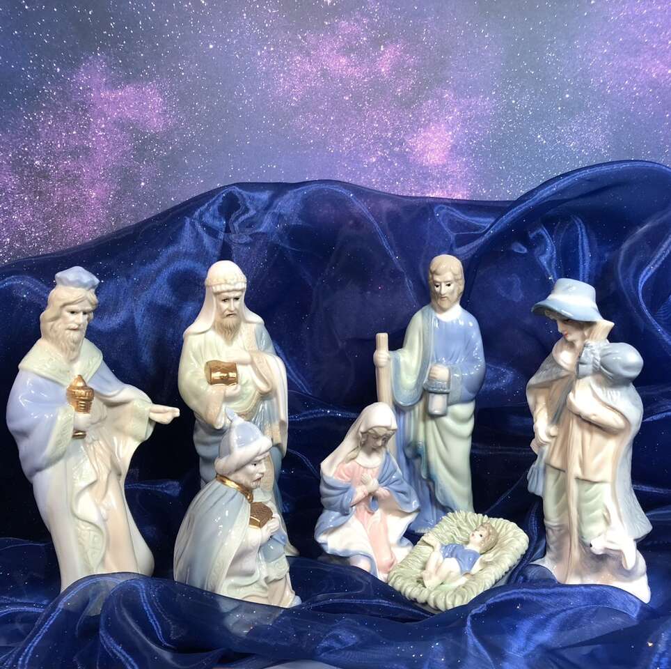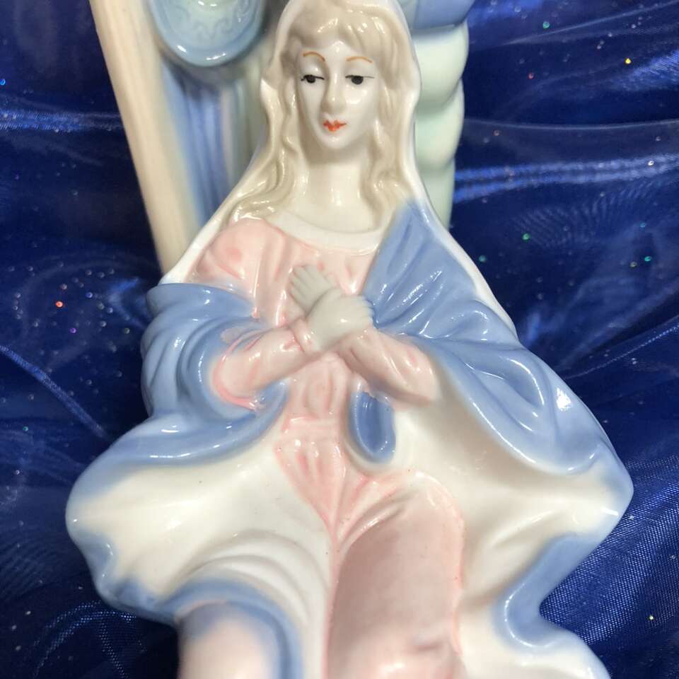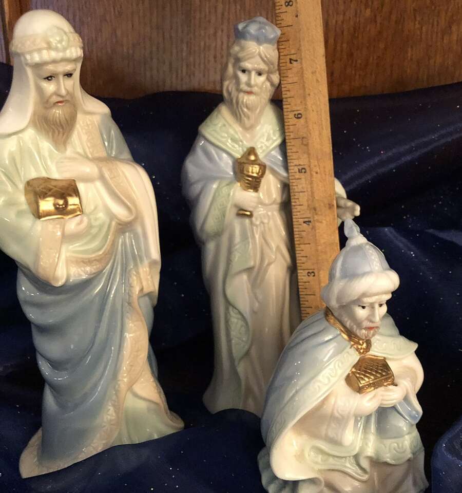 Gently used 1960’s -1970’s Vintage Ceramic Nativity Set is based on calm and serene pastel Blue & Green with additional accent colors, such as Pink on Mother Mary. Other accent colors are softer. Your grandparents probably had this set. This is the smaller version of this traditional set: tallest pieces are 7.75” tall. 10 piece set: 3 members of Holy family, 3 wise men, one shepherd, one sheep, and 2 stable animals. Smoke free. No chips, cracks, or defects. Double boxed for shipping- weighs 7 pounds- I pay the extra shipping- you pay only 7.67 for 3 day shipping. Comes in hinged cardboard box- not original but perfect for permanent storage. Photographs are of the exact set you are purchasing. Delivery available to a convenient location when in your area for $5.