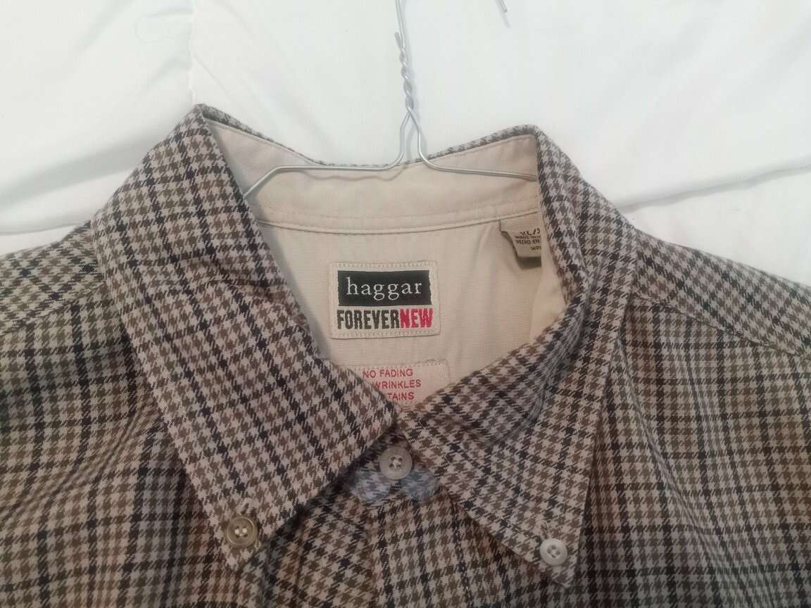 This men's Haggar XL 100% cotton long-sleeve button-up shirt with button-down collars and front pocket recently returned from the cleaners from being washed, lightly starched, and pressed. It is ready to wear. From a smoke-free home. No stains or missing buttons. Both spare buttons are still attached. Cash or Venmo only.
