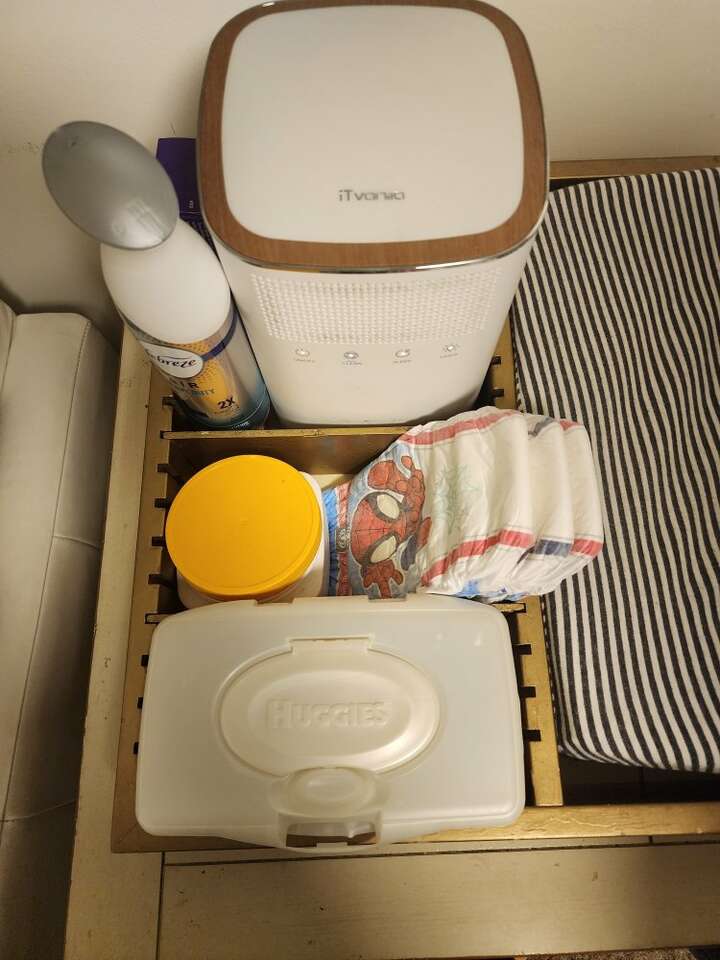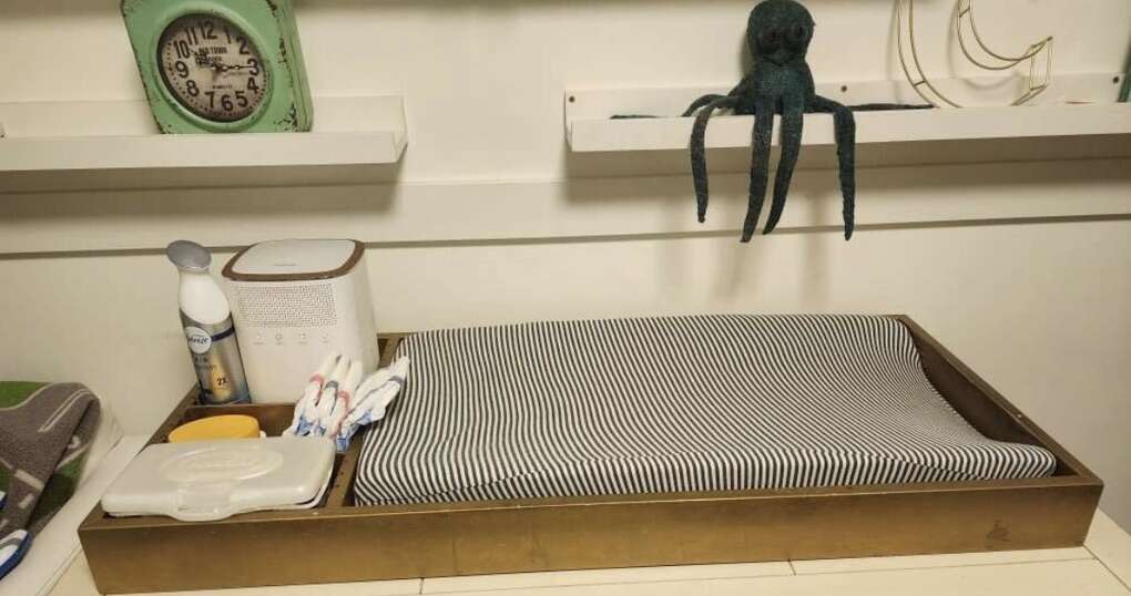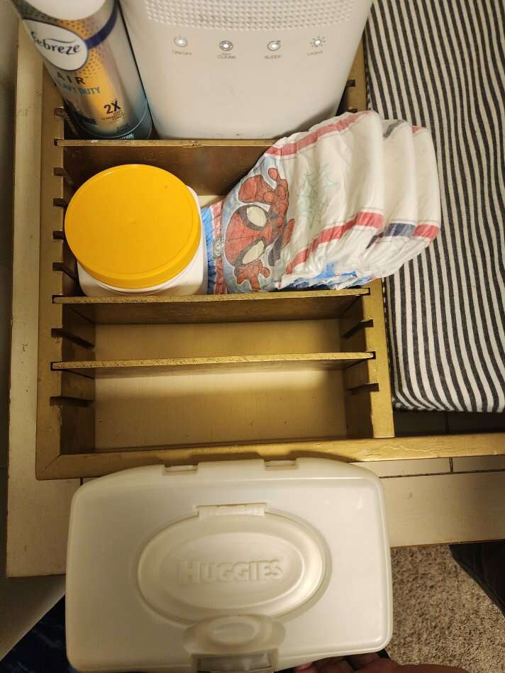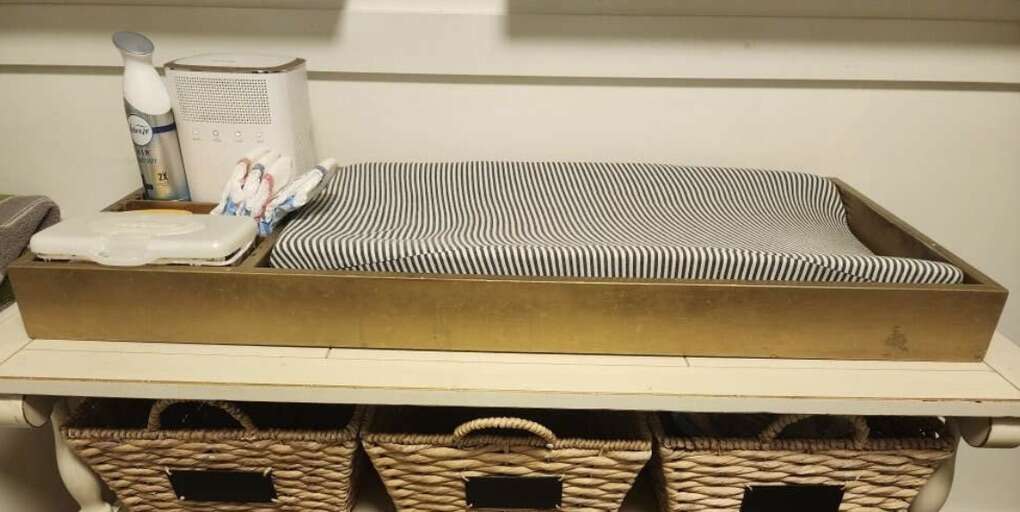 This is a gold colored custom made changing station. It is made to fit the standard changing pad. It also has an adjustable section to fit wipes, diapers and other changing items. You get the gold organizer frame and adjustable slats. As well as the changing pad and cover.