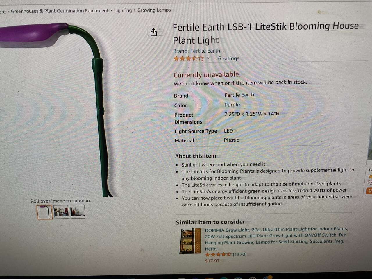 Hello I have Fertile Earth LSB-1 LiteStik Blooming House Plant Light for Indoor Growing LED Lights Sunlight Where & when you need it It's Designed to provide supplemental light to any blooming indoor plant The LiteStik is energy efficient green design uses less then 4 watts of power You can now place beutiful blooming plants in areas of your home that where once off limits because of insufficient lighting Color Green & Purple Light Source Type LED Product Dimensions 7.25'D_1.25W_14"H I bought a huge Box of these a few Years ago from a Garden Nursery For friends and family as a gift for christmas everybody has been really happy with them they work great during the night with all the colors it looks really beutiful i still have some left so i decided to give people a really good deal & just asking 10 each they are sold out online really popular great deal they cost anywhere from 25 to 35 each perfect gift for indoor plant growers all are Brand New in original packaging