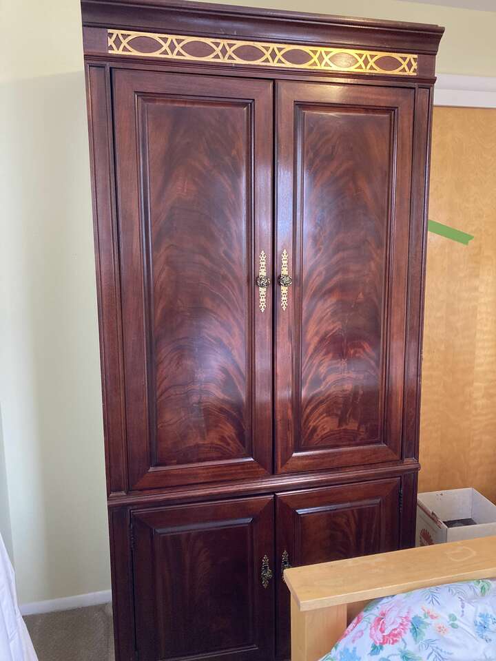 Beautiful crotch mahogany entertainment center, with pocket doors and pull out TV swiveling shelf and one dove tailed drawer.
