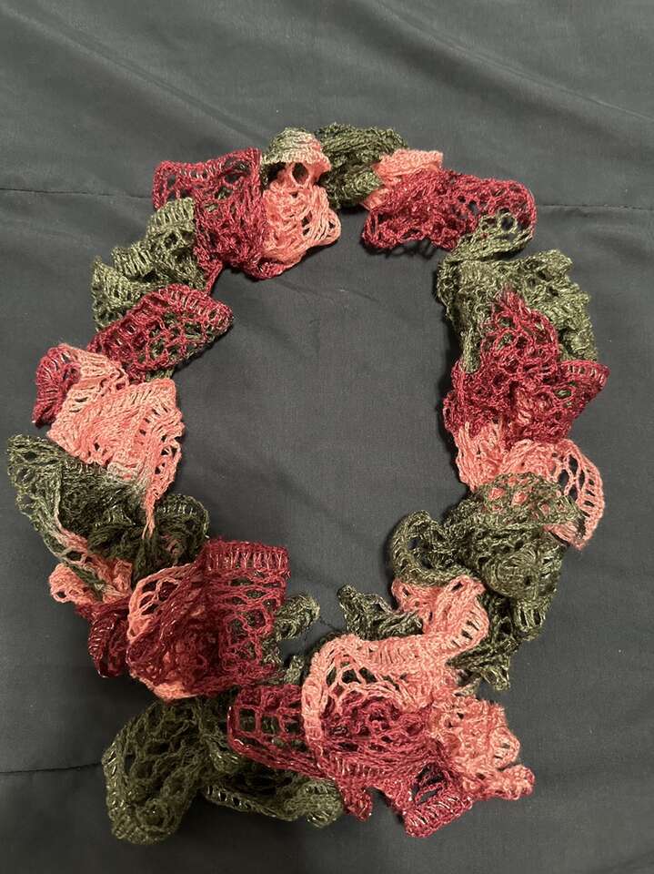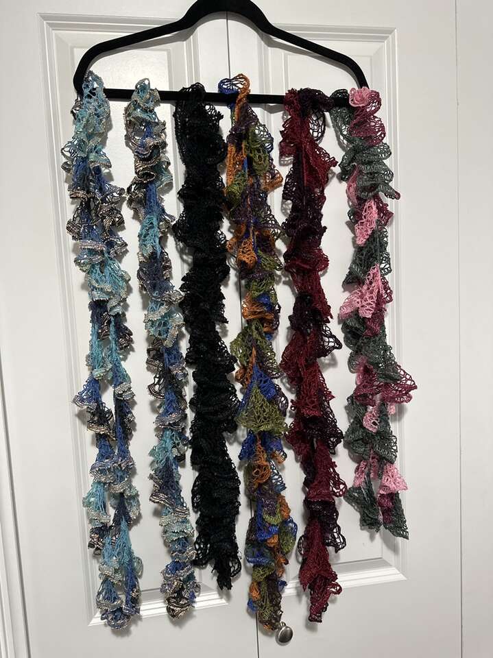 All new hand made ruffle scarfs. All are about 52 inches long. 12 available. $10 Each. Smoke/Pet free home.