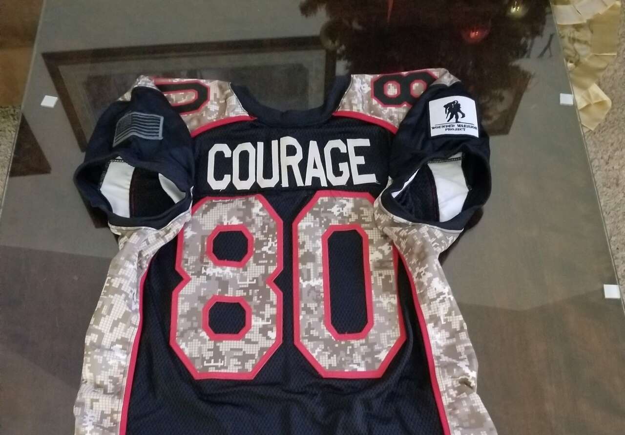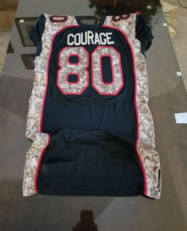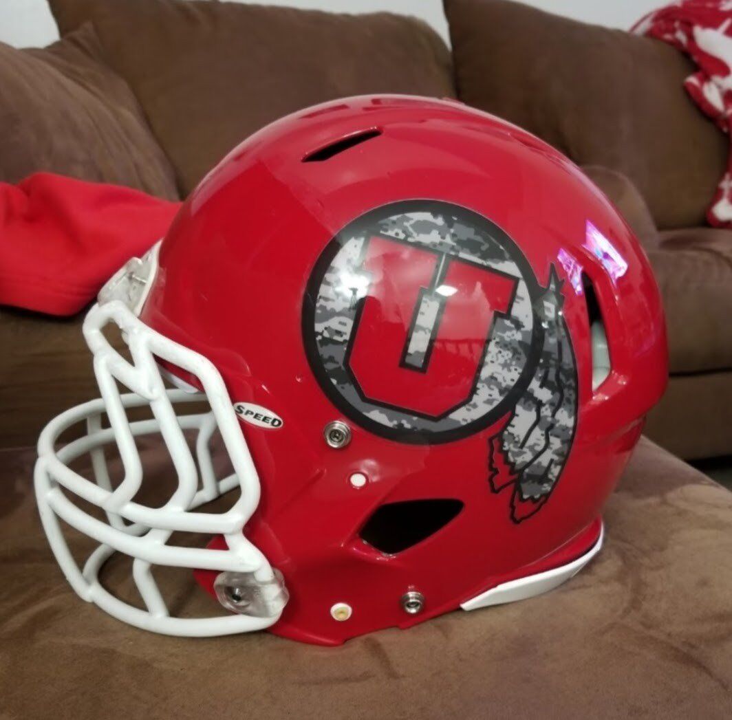 I have a 2010 game worn/issued Utah Utes Courage Jersey from 2010 when #3 TCU vs #5 Utah played at Rice Eccles Stadium. This is an amazing looking Jersey that displays the black and grey American flag patch on the left arm and the Wounded Warrior Project patch on the right arm. This Jersey is a 42 Tall 2010. A must have for any serious utes fan collection. Can be displayed in your man cave or she shed and can be worn tailgating or at games as some fans did at this years 2022 veterans day game. Also included is a replica helmet with the camo drum and feather.