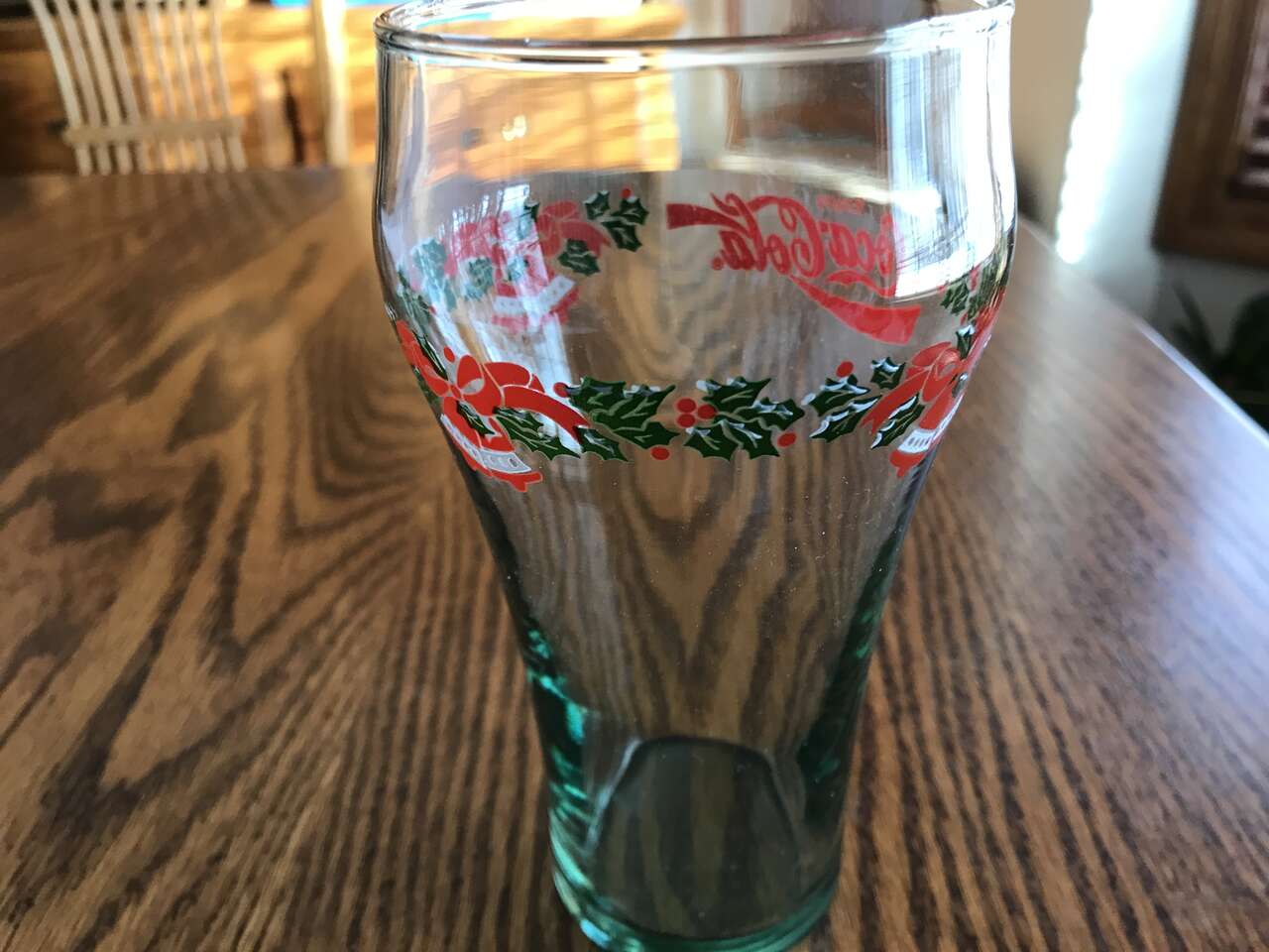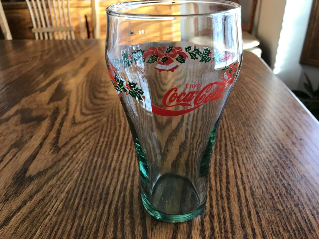 12 Vintage Libbey Coca-Cola Set of 12 Glasses with Christmas Holly Leaves, Berries and Bells on lightly green tinted glass. Like new in excellent condition. Only 1 is pictured but all look the same.