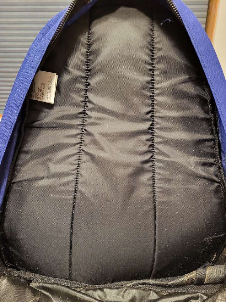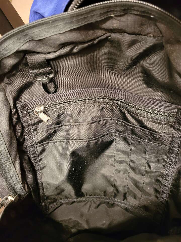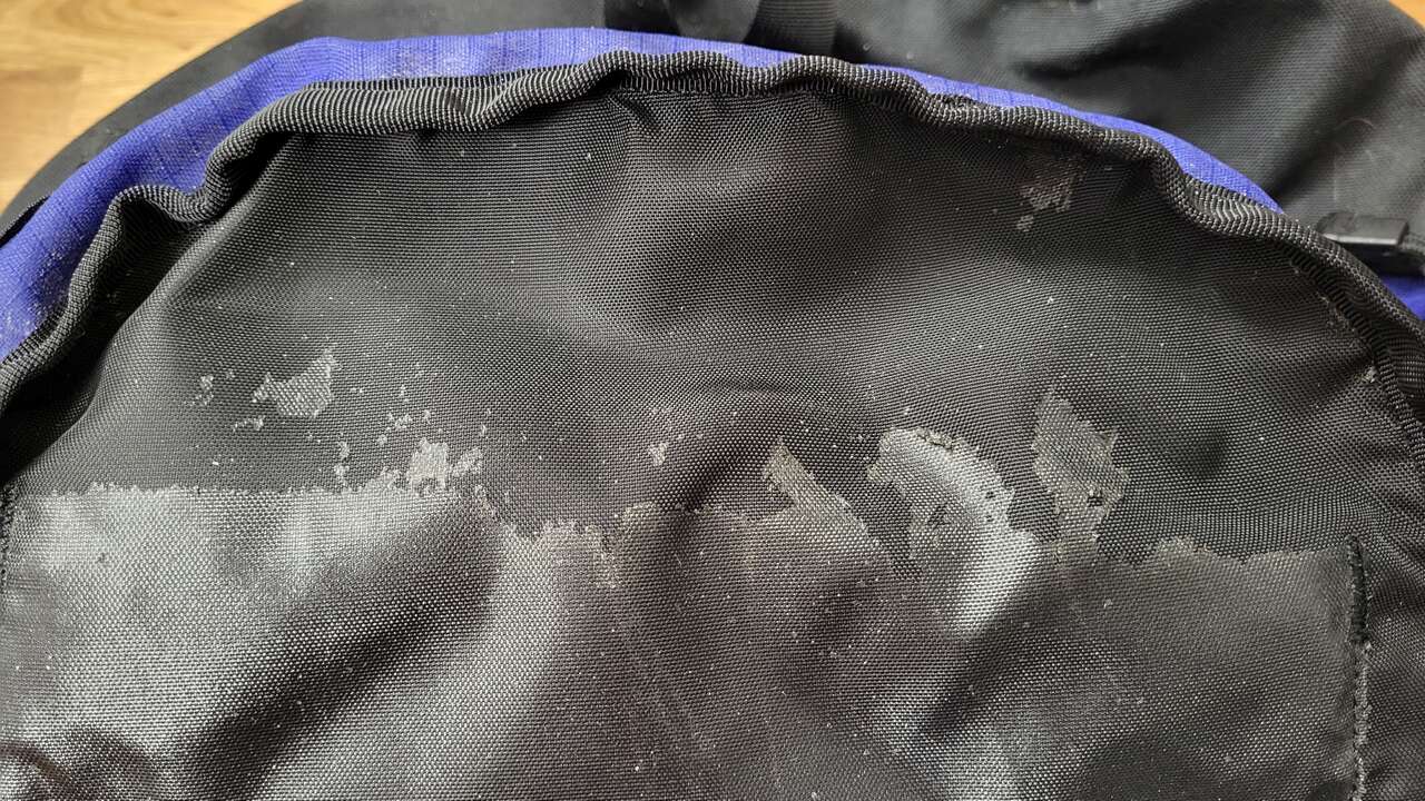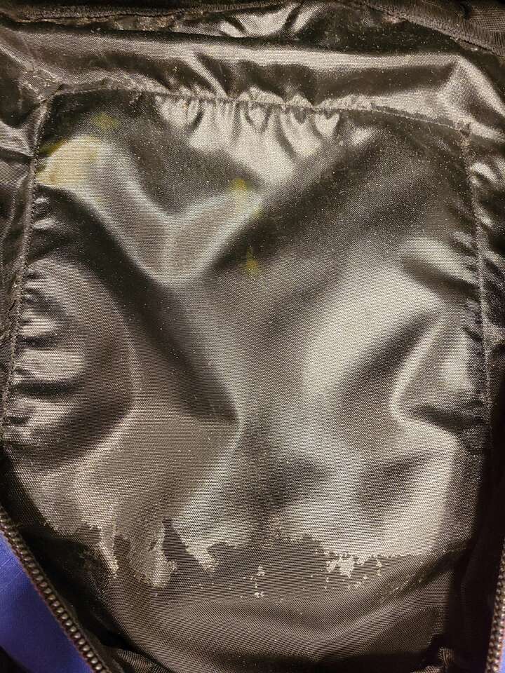 The waterproof coating on the inside of some of the outer layers is flaking off and there is a 5/8” tear on the back at the bottom edge (shown in the photos). Other than that it is in good condition. It measures 19 x 13 x 6.5 inches.