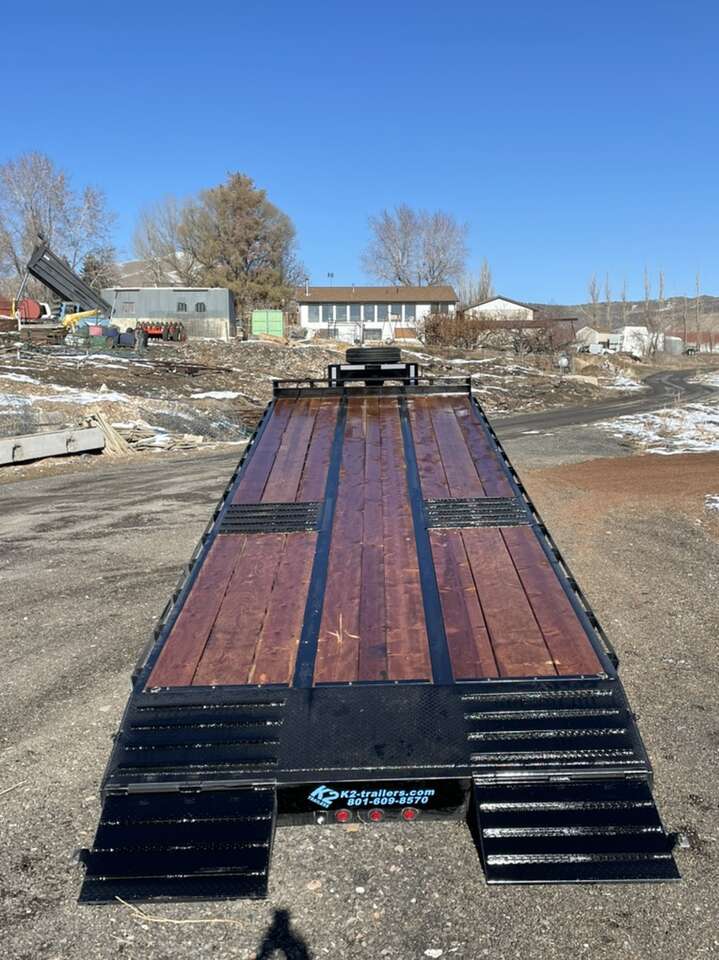 Brand new Deluxe Hydraulic Walton Tilt deck trailer with Hydraulic jacks. This is one amazing stout trailer. Also comes in a 20k or 24k rating. GVWR / GAWR: 30,000 Lbs Mainframe: 10 x 22 lb Beam Gooseneck- 2-5/16 Adujstable Coupler Deck: 2 x 10 Treated Douglas Fir Bed Width: 96.5 Deck/Layout Standard is 3' Stationary/ 23' Tilt Tilt Angle: 11 Degree Axles: Dexter Tandem Dually 12k Slipper Springs Tires: 235/80R16 E on 8-Hole Wheel (Dually) Brakes: Electric Landing Gear: Dual 12K Hydraulic Jacks Tie Downs: 1 D- Rings (6 Per Side) Spare Mount: Gooseneck - Mounted on Gooseneck Chain Box: Chain Box and Locking Lid Cross Members: 4 Channel Lights: DOT Approved LED Sealed Beam With Rubber Grommet Wiring: DOT Modular Wiring Harness Safety: Reflective Tape, Safety Chains with Hooks, Break-Away Switch with Battery Charger Finish: Black Powder Coat Finish Warranty: One Year Limited Structure website: www.k2-trailers.com Visit us on Facebook https://www.facebook.com/k2trailers/
