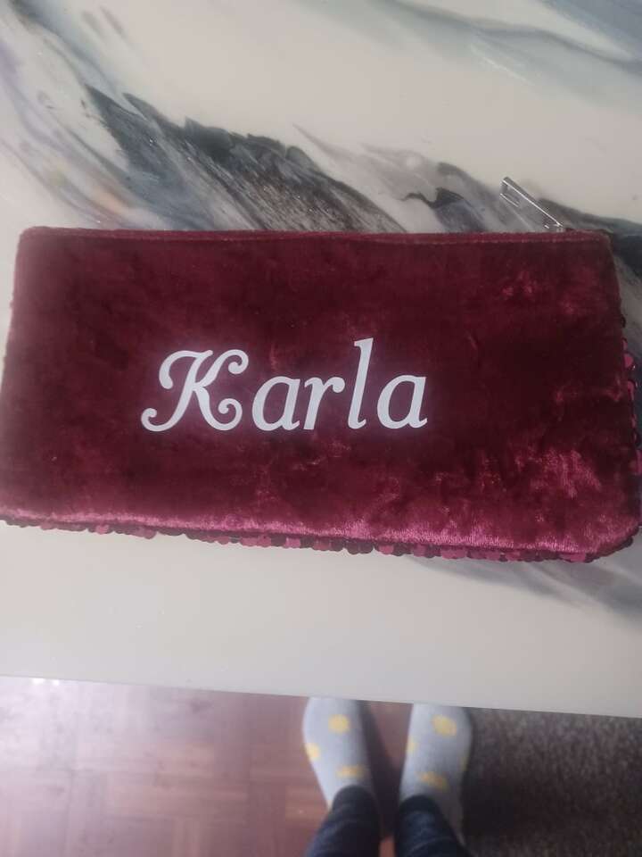 Heart shaped necklace with a K on it and a little make up bag with sequins on it