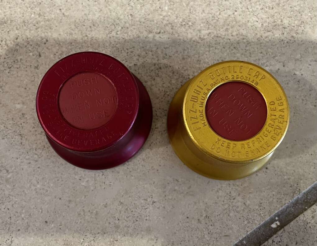 I have 2 vintage Fizz-Whiz bottle caps that look like new. One is dark red and the other is gold. $2 for both together. See my other ads for jewelry, artwork, home decor and more.