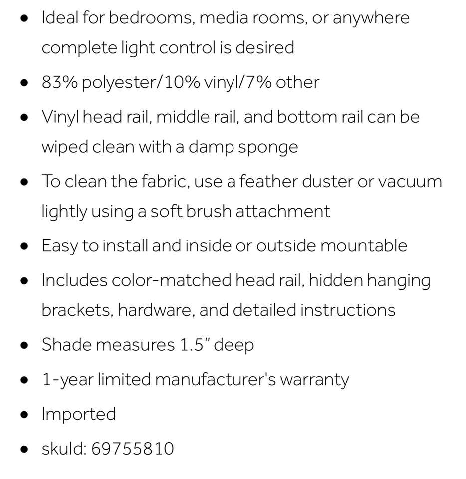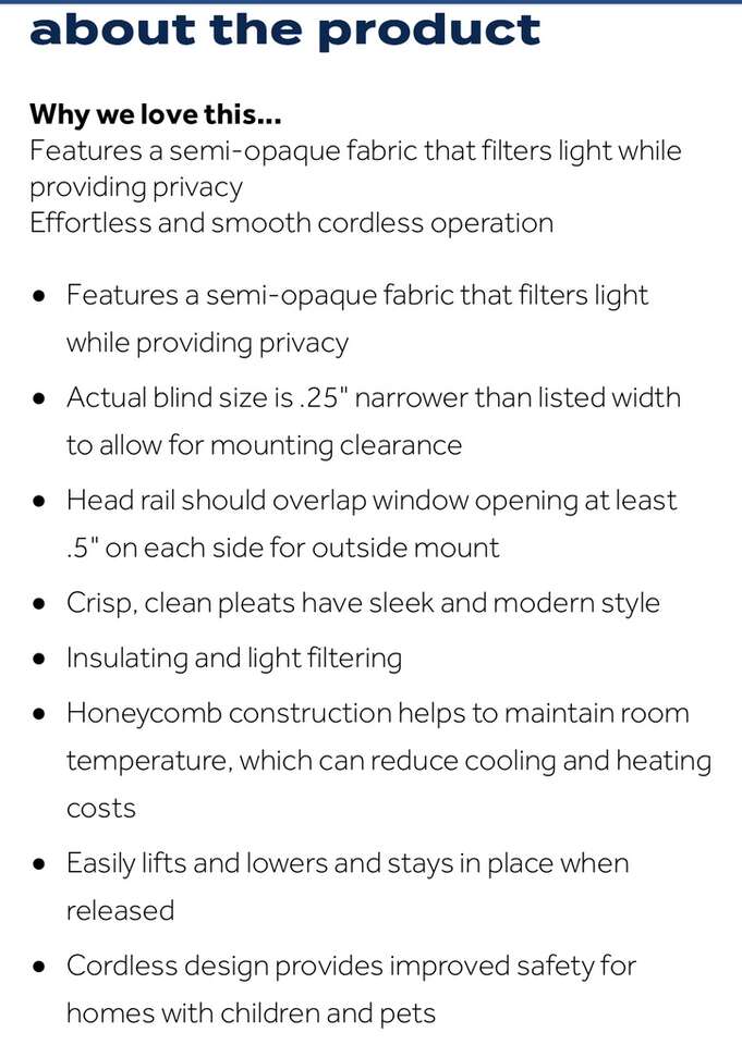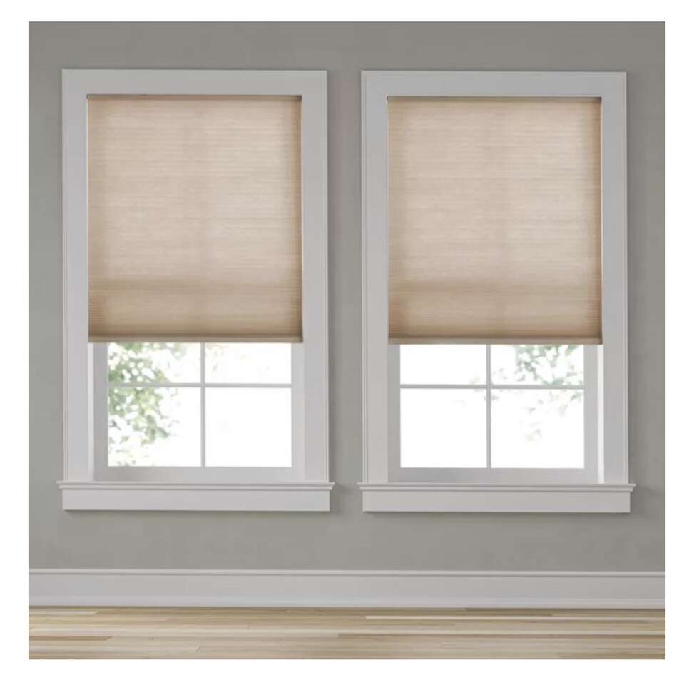 Description- Cordless light filtering cellular shade in sand (off-white) ACTUAL CUT SIZE is 65 7/8” wide by 48” tall. See photos for more product information and specifications.