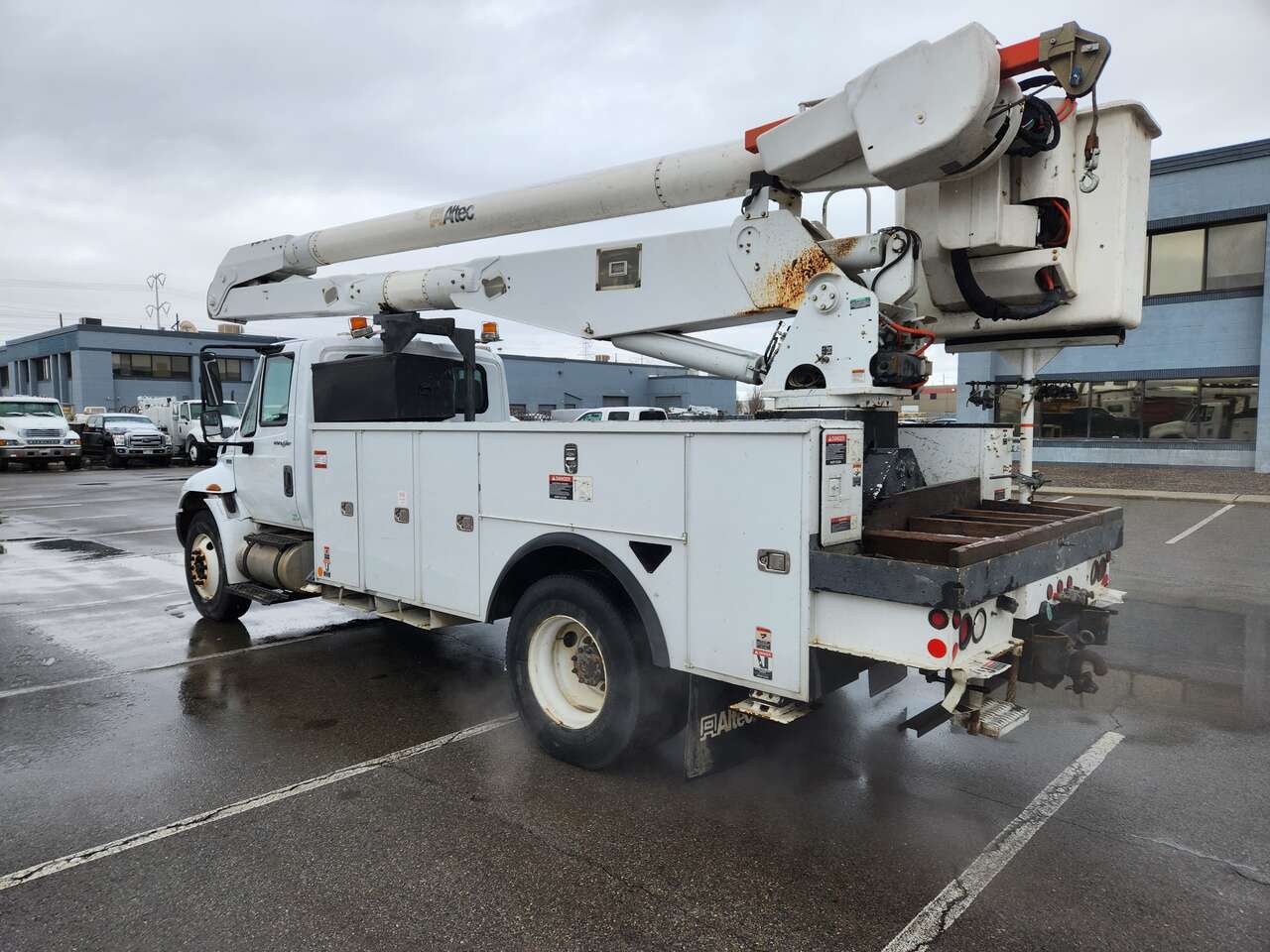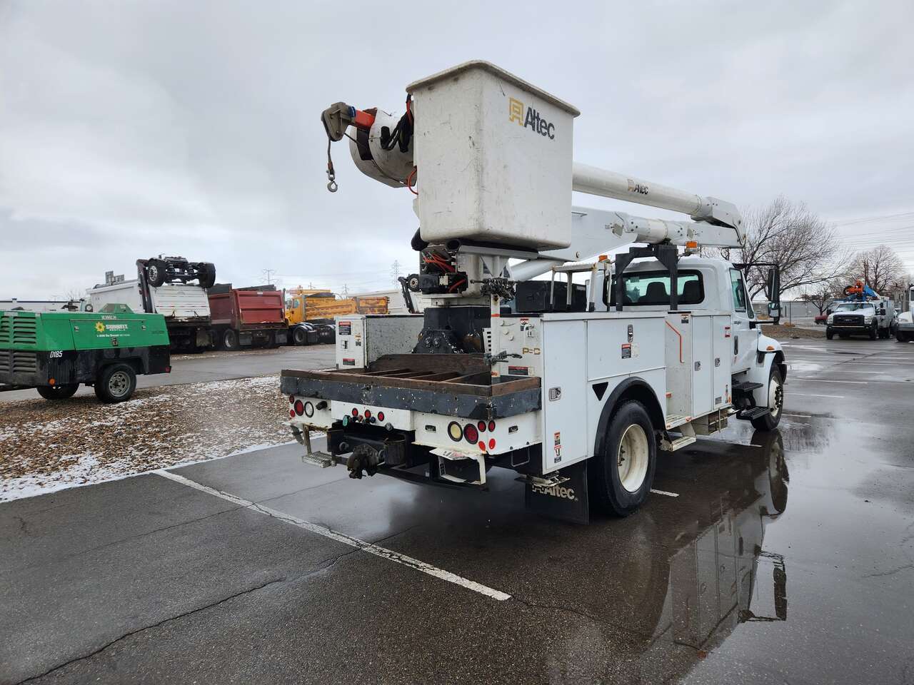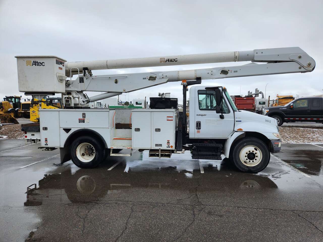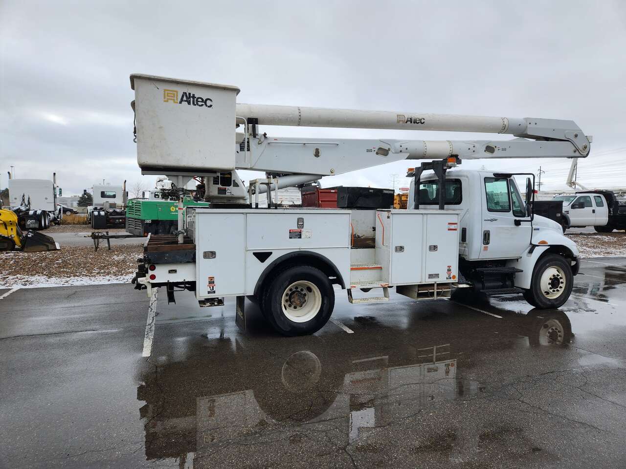 Altec AM755MH, 55' Platform Ht, 60' Working Height, Material Handling Jib, International MaxxForce 6 Cylinder Diesel Engine, 230 HP, 94k Miles, 9512 Engine hrs, Allison Automatic Transmission, 13000 lb Front Axle, 20000 lb Rears, 33000 lb GVWR, 11R22.5, Spring Suspension, 188 in Wheelbase, PTO, 700 lb Capacity, Rear Mounted, Insulated Two-Person Articulated Boom, Utility Body, Boom Tip Mounted Winch, Out and Down Outriggers, Rear Outriggers, 14 ft 6 in x 94 in Bed, Pintle Hitch