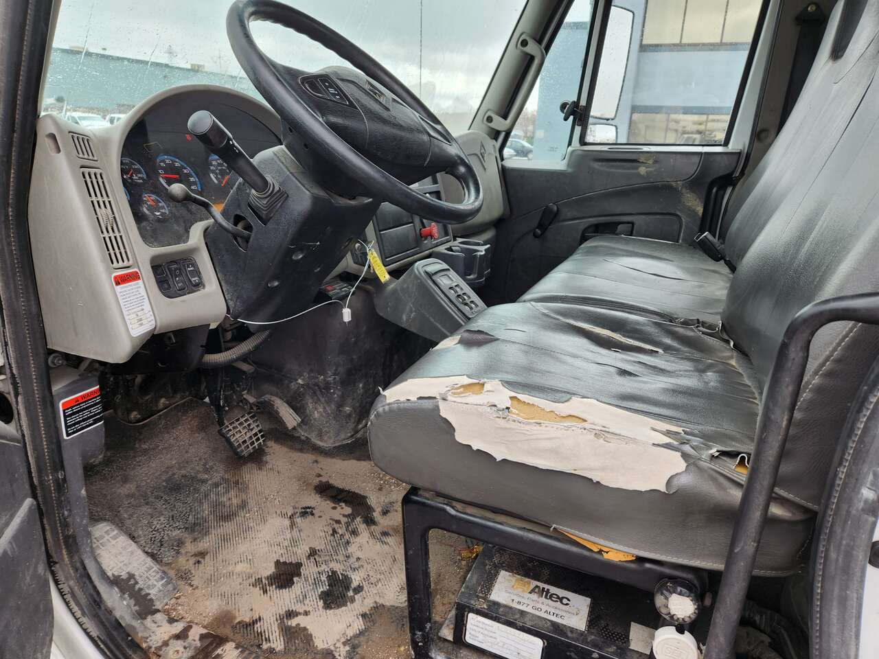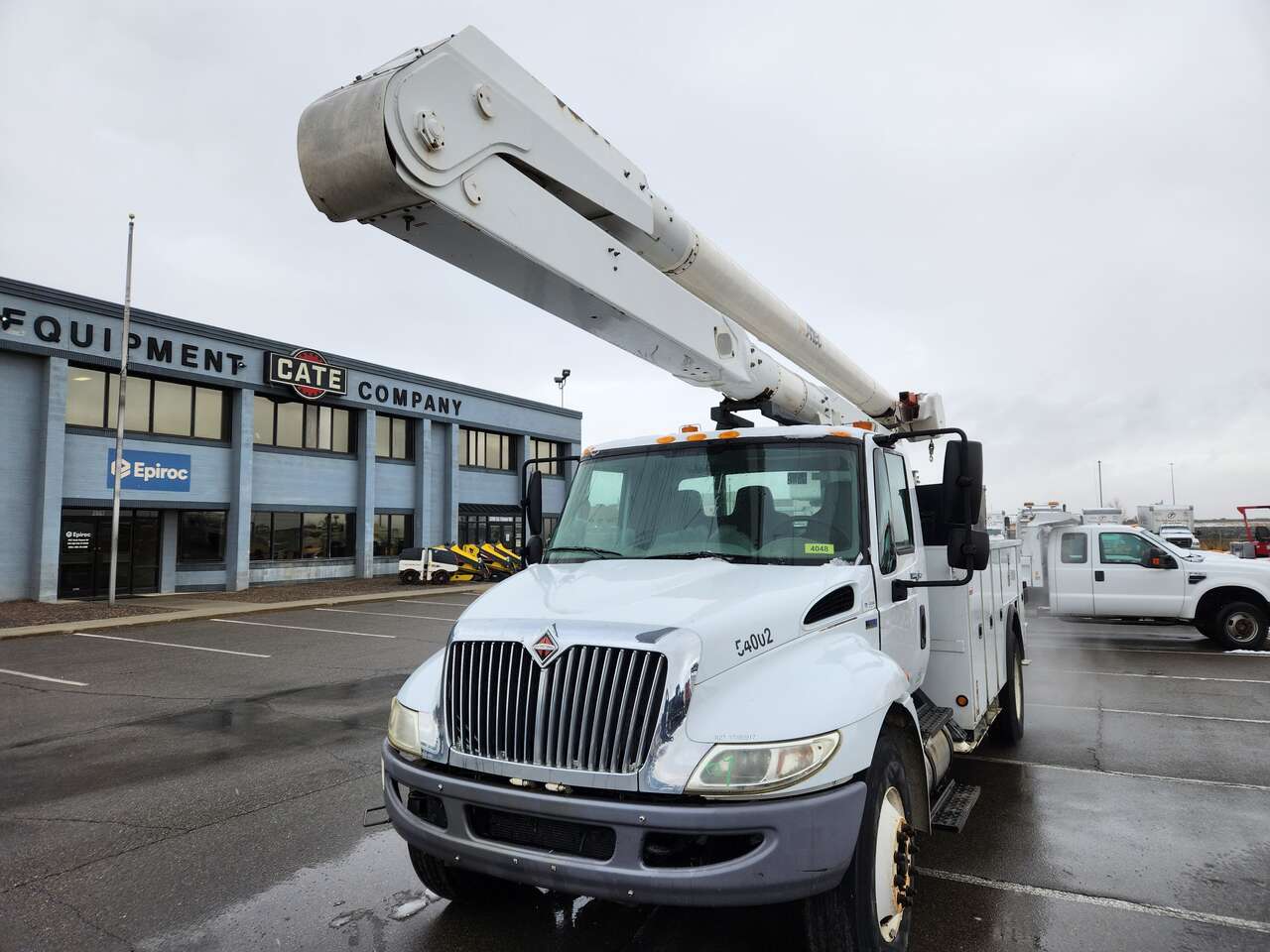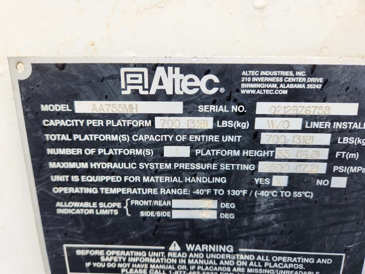 Altec AM755MH, 55' Platform Ht, 60' Working Height, Material Handling Jib, International MaxxForce 6 Cylinder Diesel Engine, 230 HP, 94k Miles, 9512 Engine hrs, Allison Automatic Transmission, 13000 lb Front Axle, 20000 lb Rears, 33000 lb GVWR, 11R22.5, Spring Suspension, 188 in Wheelbase, PTO, 700 lb Capacity, Rear Mounted, Insulated Two-Person Articulated Boom, Utility Body, Boom Tip Mounted Winch, Out and Down Outriggers, Rear Outriggers, 14 ft 6 in x 94 in Bed, Pintle Hitch