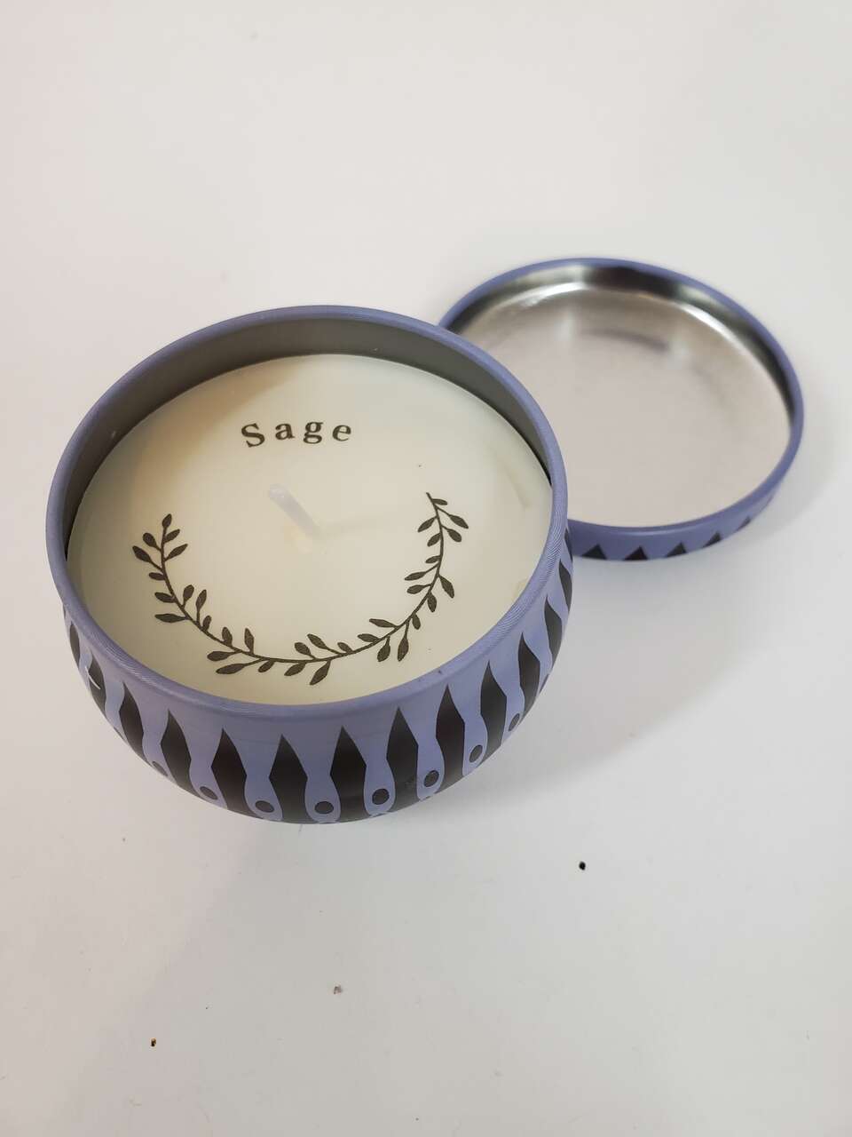 Mini Candle Travel Tin - Beautifully Scented Sage Aromatherapy Candle. When completely burned out, this striking tin can be used for storage of trinkets and small change. Cash Only, No Codes.