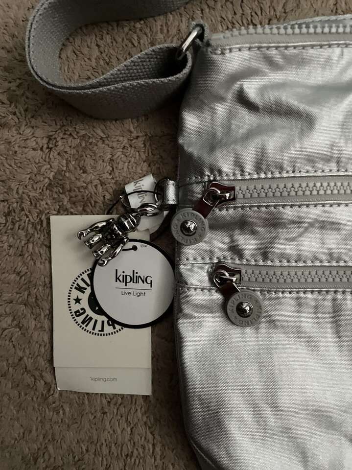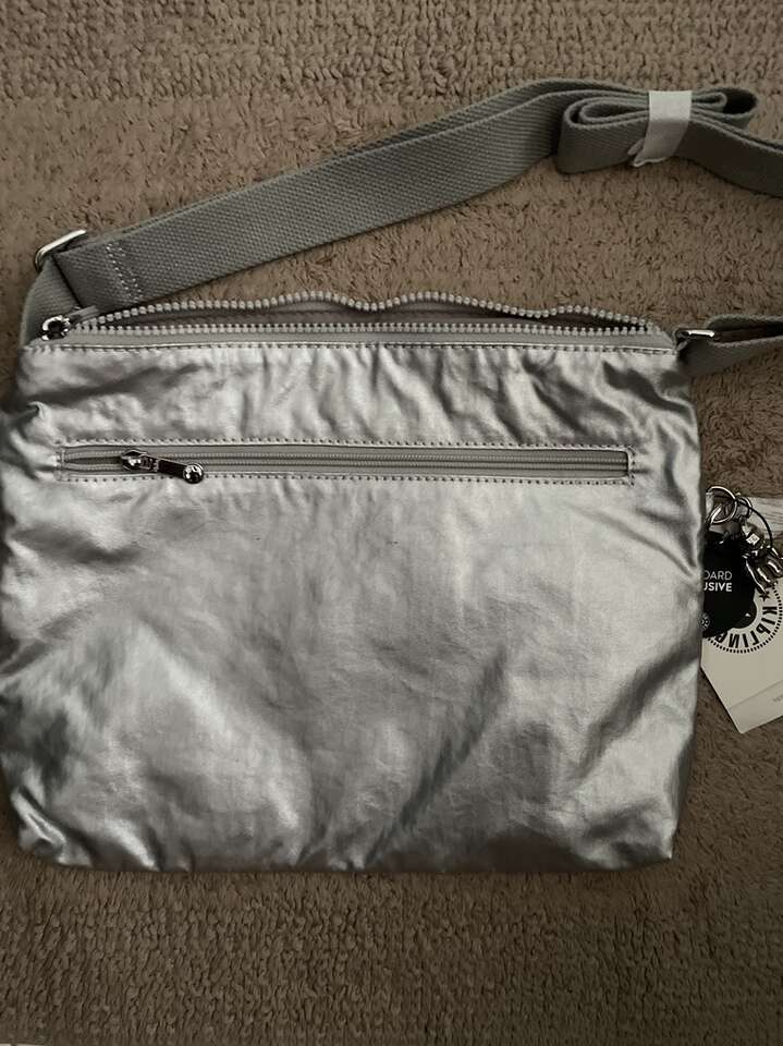 New with tags. Perfect travel bag with lots of room. Made with attention to detail. Platinum Metallic color (silver) Retail price is $94 Dimensions: 13L x 10.25H x 1.75D Two front zip pockets Two main zip compartments Adjustable crossbody strap Strap inside with clip Monkey keychain (attached on the side by the tags) Shortest Strap Length: 29.5 Extended Strap Length: 55.5
