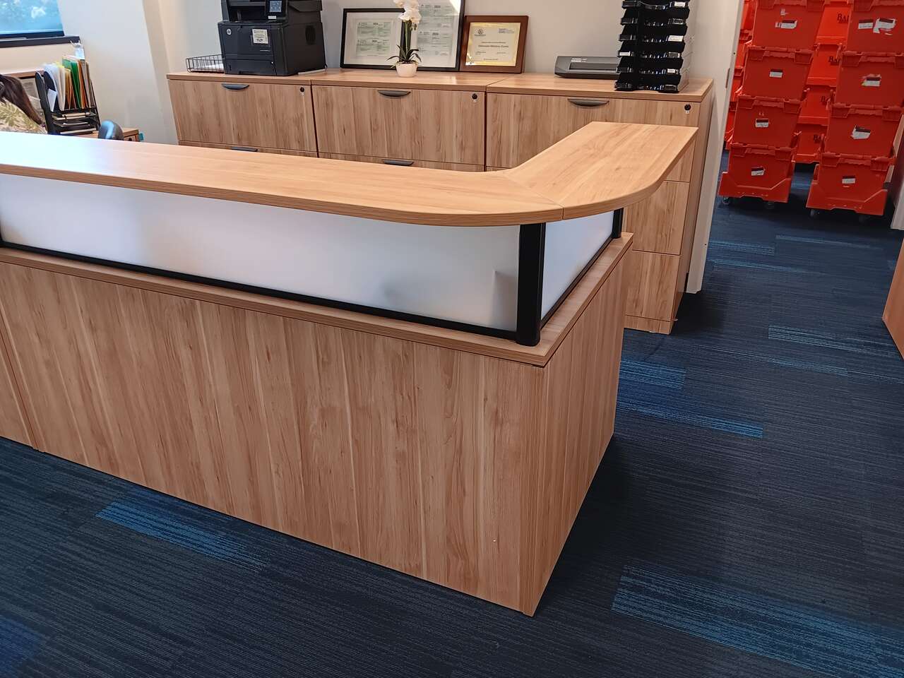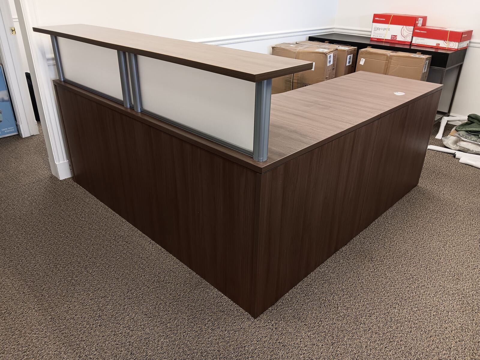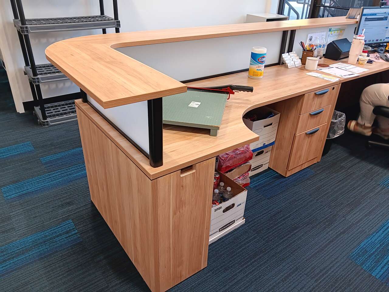 Reception Desk, We have several different styles of reception desks available. This desk comes in several different colors, New port Grey, Silver Birch, Aspen, Cherry,Espresso, and Modern Walnut . Can add a return on either side or do just the front desk. so many options, All accented with impact resistant edges. File drawers can be added as well. See more by seller to see all of our furniture options.