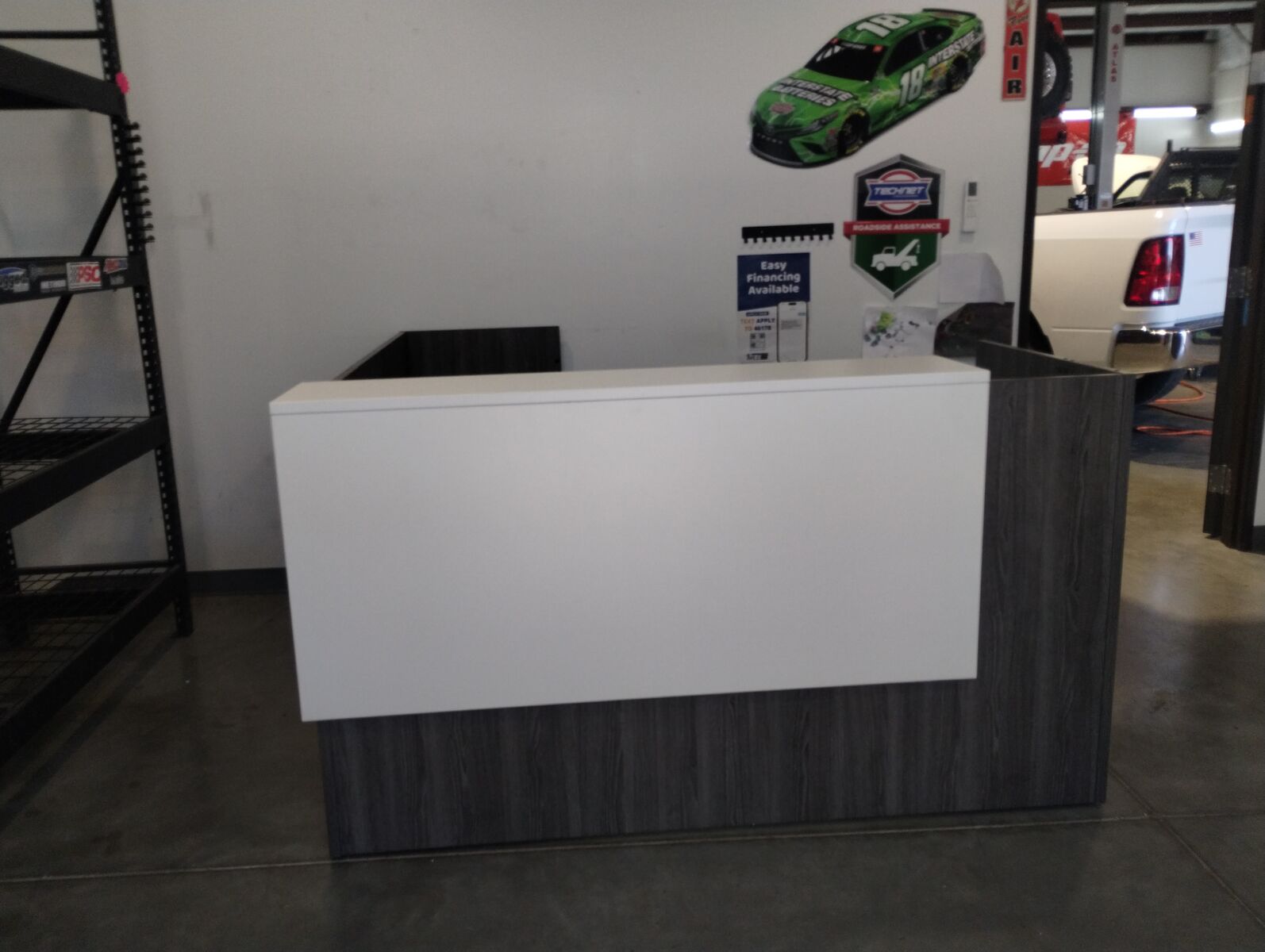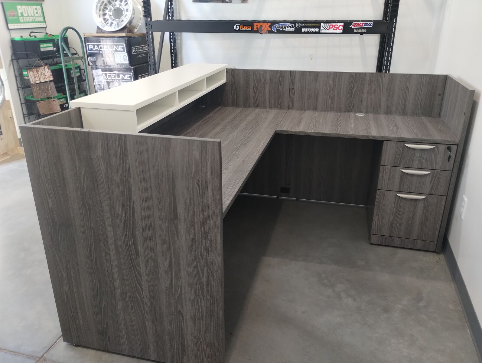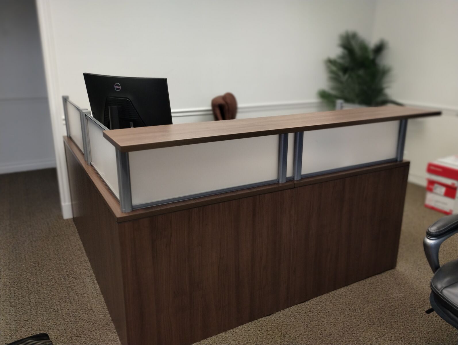 Reception Desk, We have several different styles of reception desks available. This desk comes in several different colors, New port Grey, Silver Birch, Aspen, Cherry,Espresso, and Modern Walnut . Can add a return on either side or do just the front desk. so many options, All accented with impact resistant edges. File drawers can be added as well. See more by seller to see all of our furniture options.