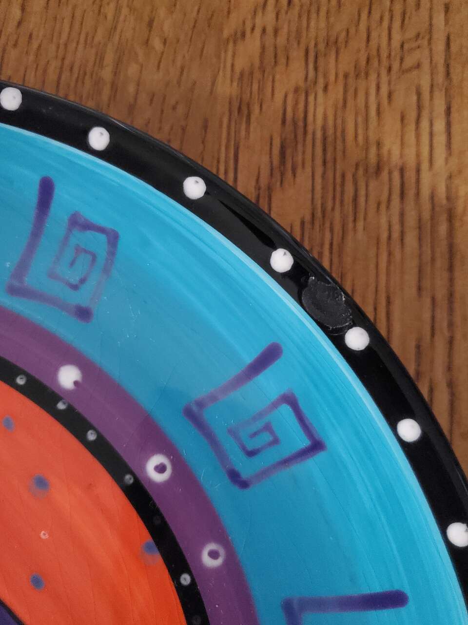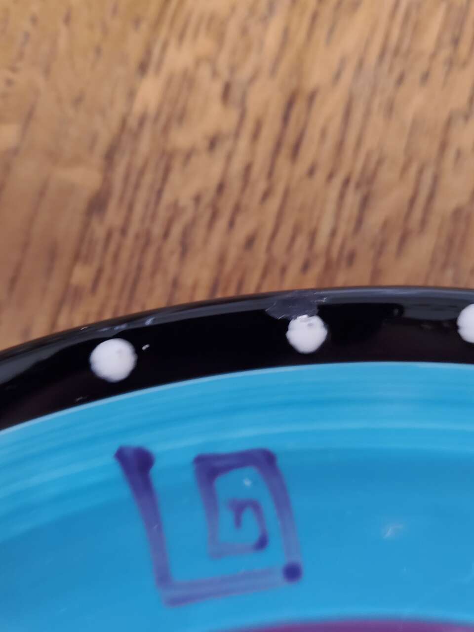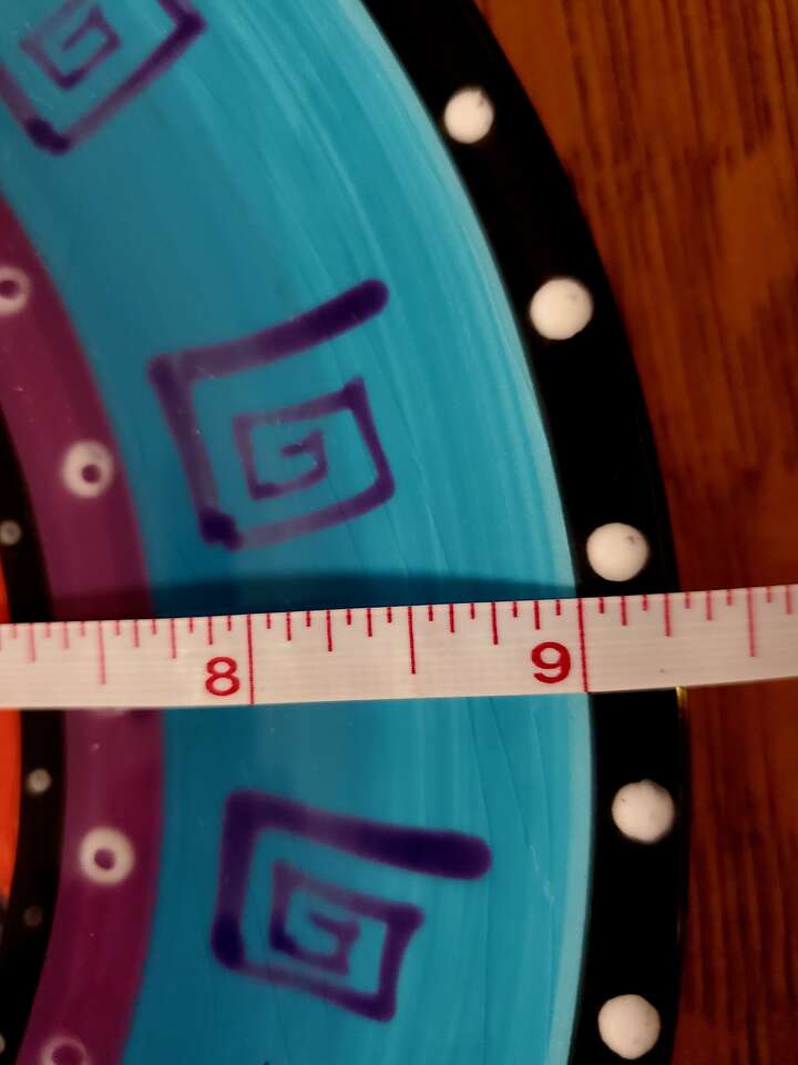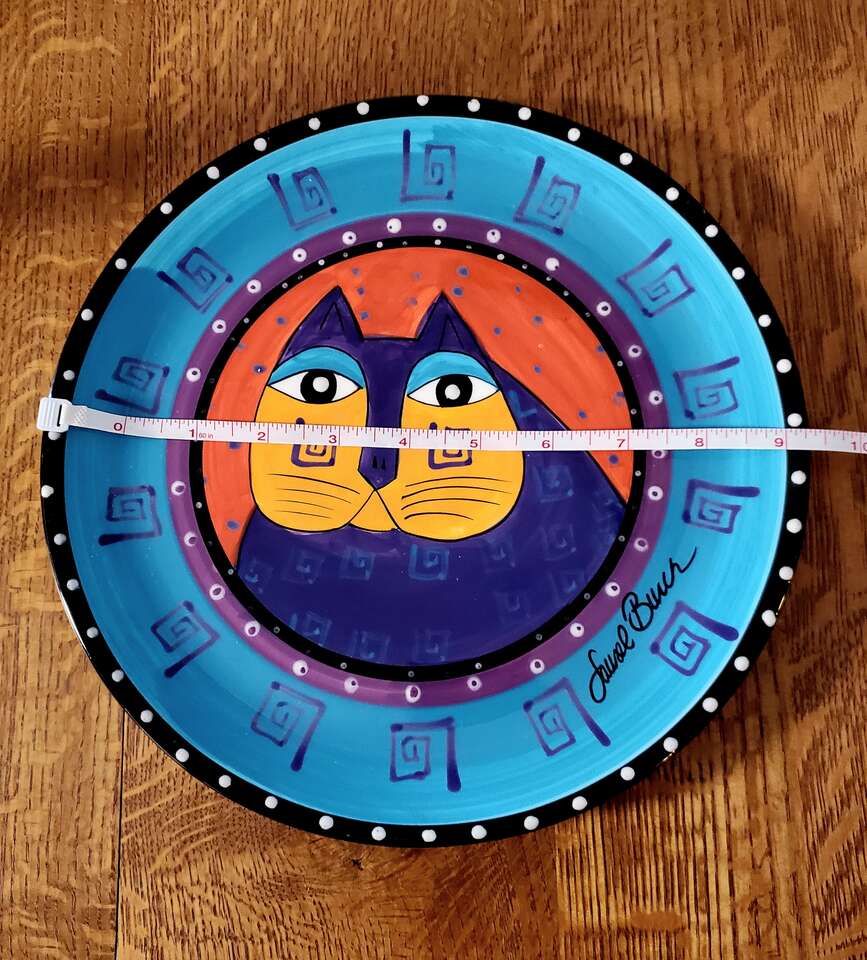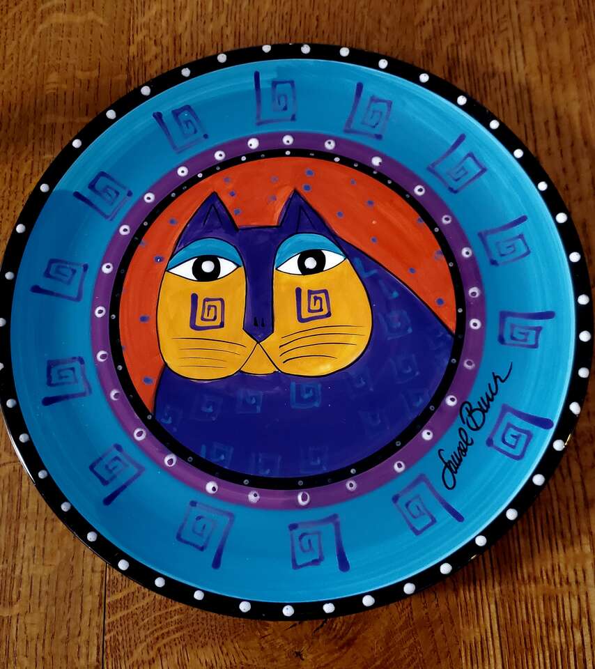 Colorfully Painted Vintage Whimsical Purple Cat 9" Plate Signature Laurel Burch by Ganz. 3 small chips discovered in the outside border. (see pics). Cash Only, No Codes