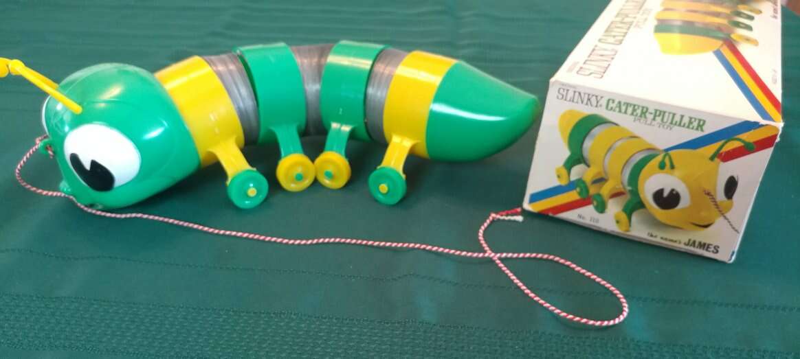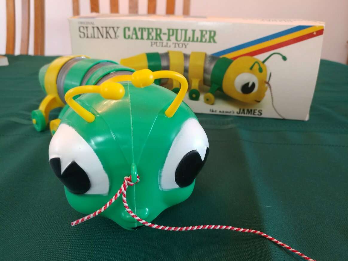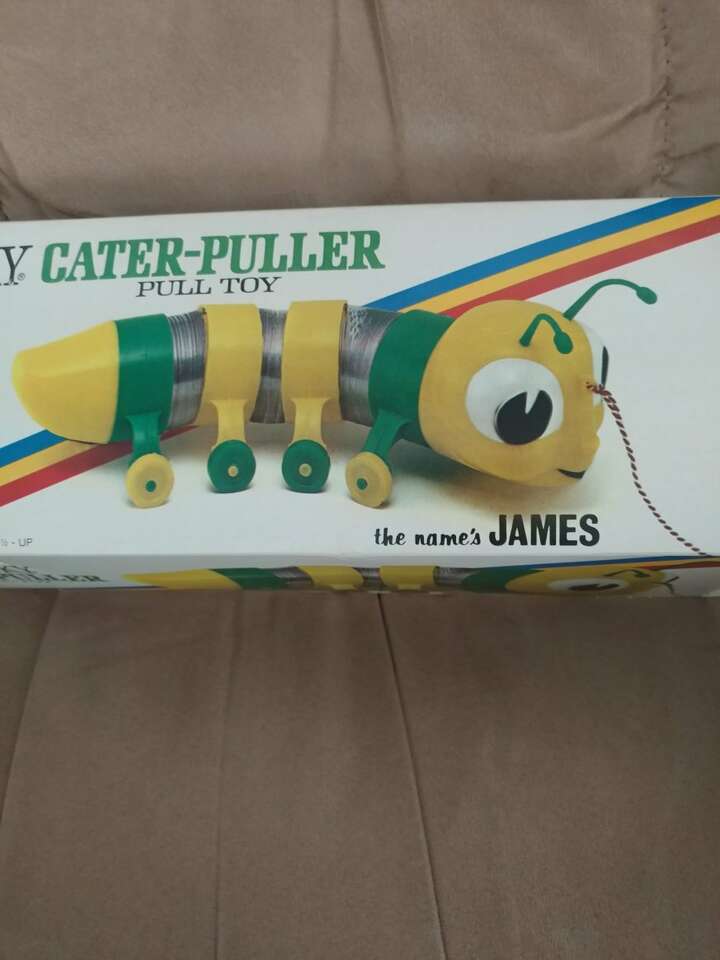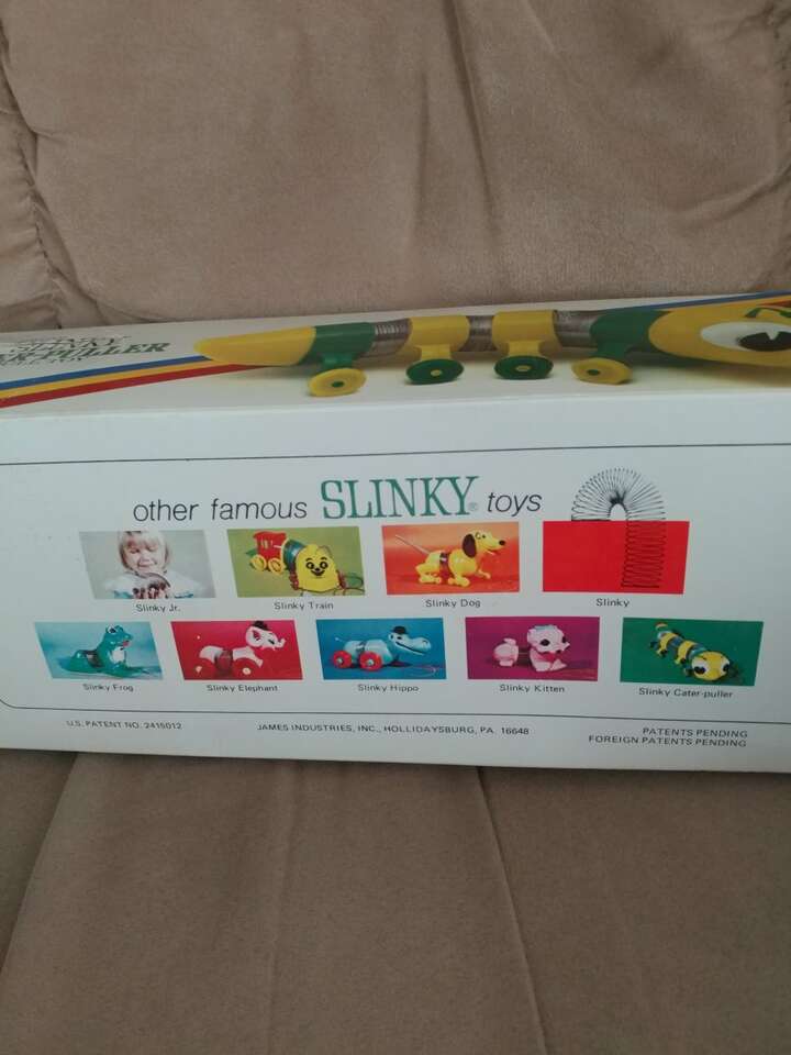 Original 1970's No. 310 Slinky Cater-puller named James. Brand new, never used. Torn paper on one side of the box but still intact. James Industries, Inc., Hollidaysburg, PA 16648 U.S. Patent No. 2415012 Perfect for a collector of slinky toys. Price- $50