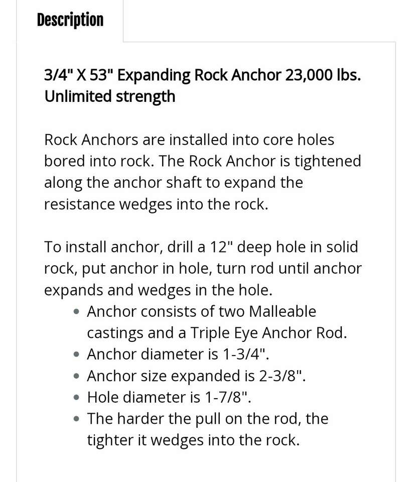 Expanding rock anchors 23,000 lbs Unlimited strength. See photos for details. Retails for $79.00