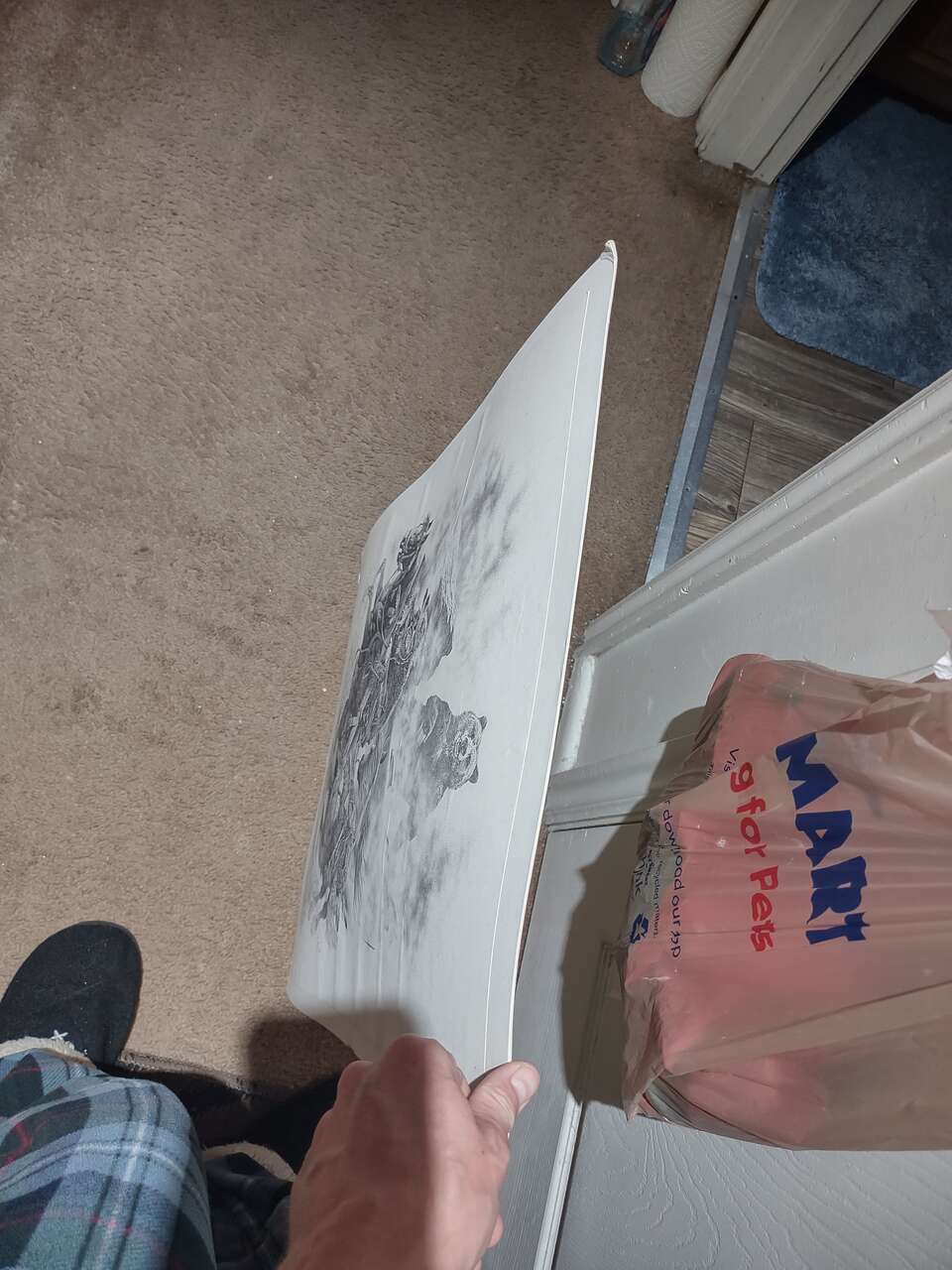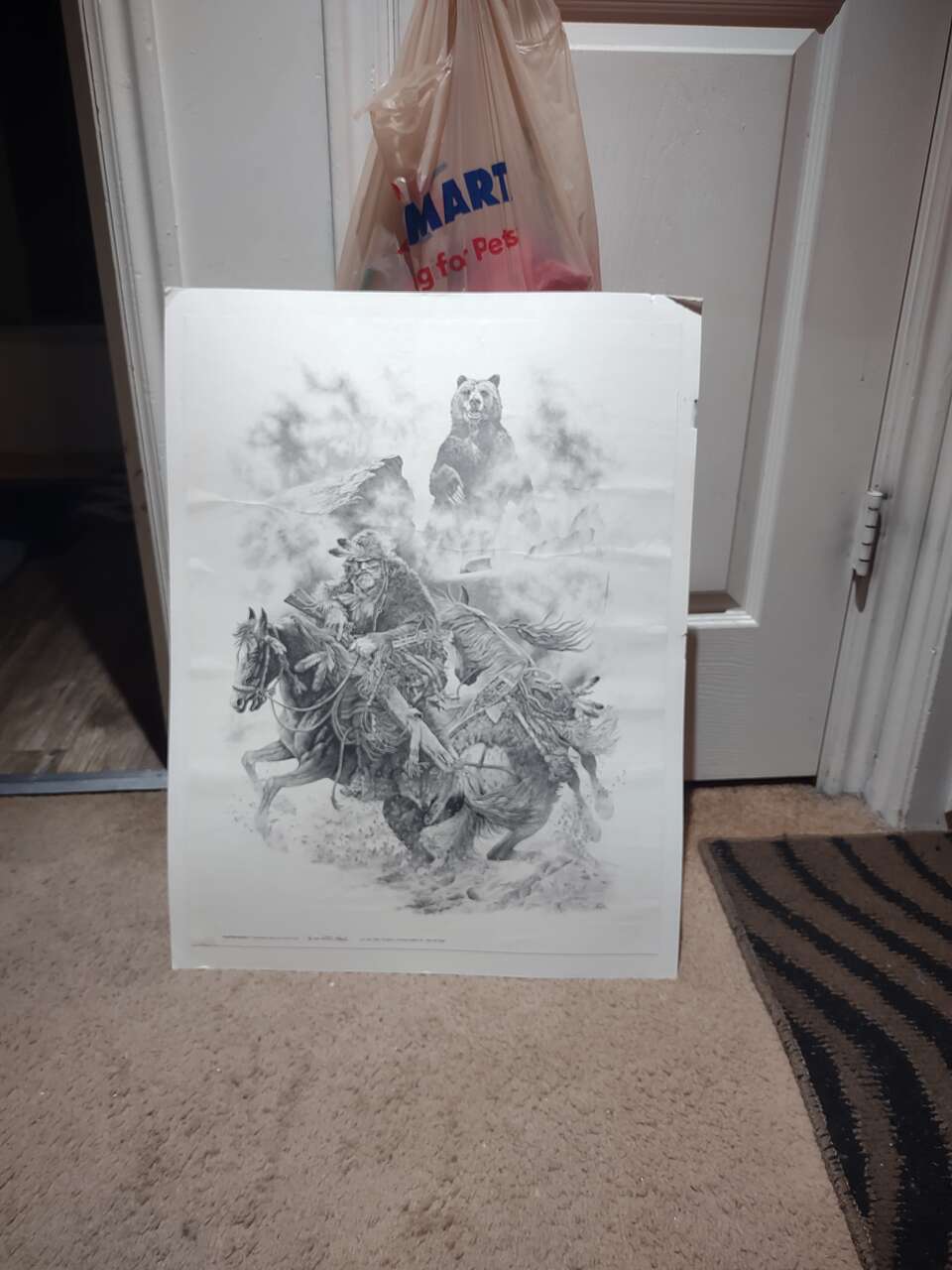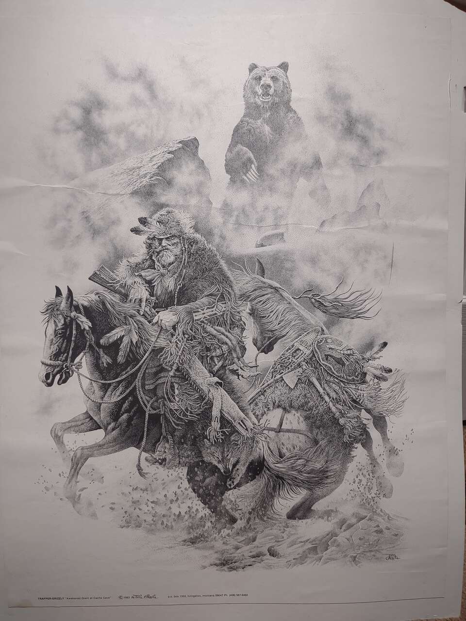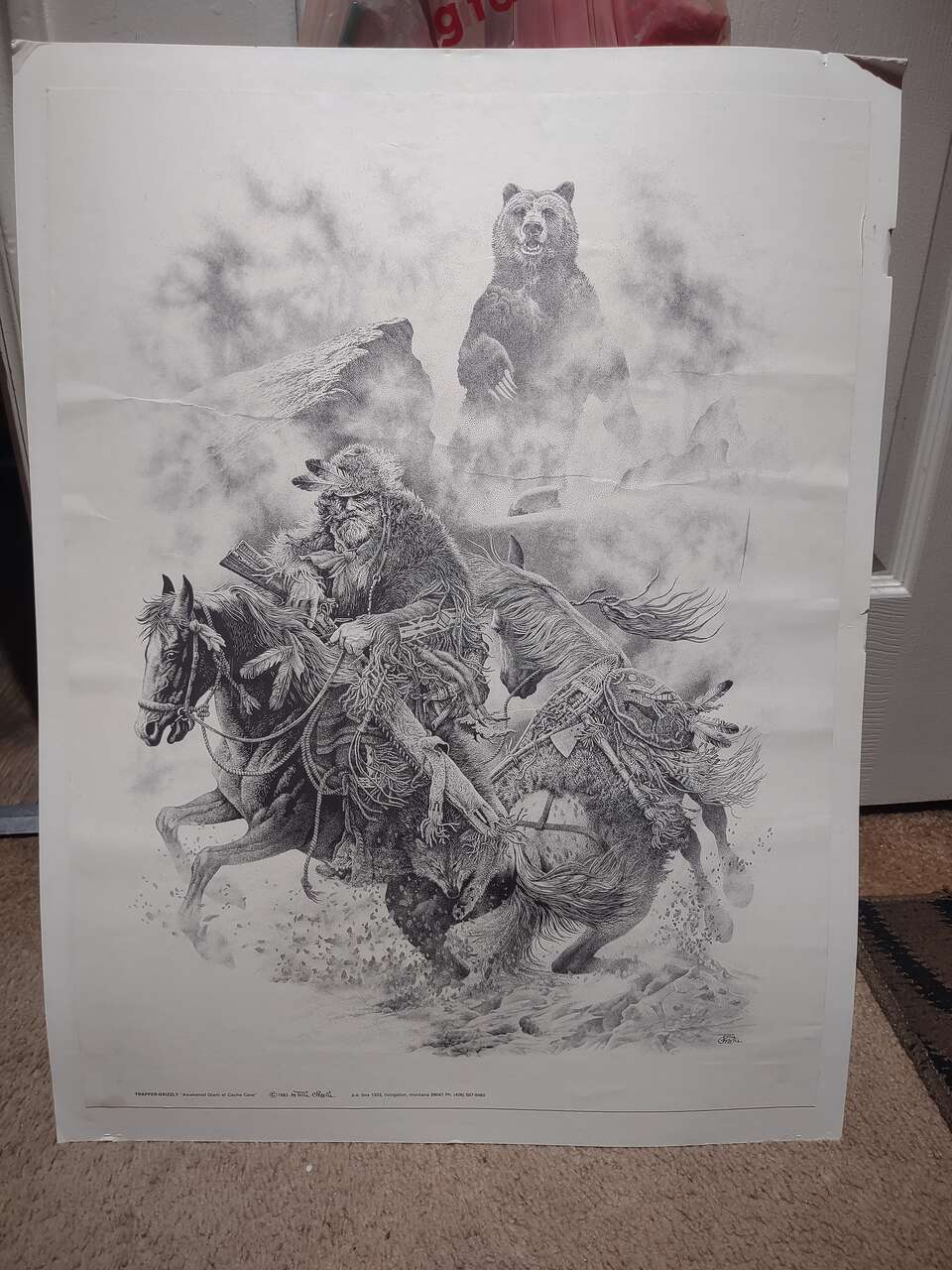 Beautiful and surreal reflection of life in the early settler days as a hunter and trapper. A nice reprint from 1983 worth hanging in any outdoorsmens room.