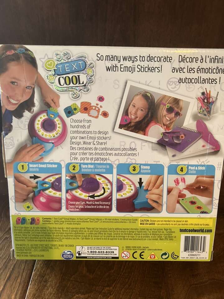 Brand new, in box and never been opened Text Cool emoji sticker maker for phones, glasses, notebooks, books, etc. Here’s what’s included: *Emoji sticker maker *25 emoji stickers *50 mini stickers Perfect for a birthday or holiday gift or crafting with the kids. Smoke free home. Text preferred. Cash or Venmo.