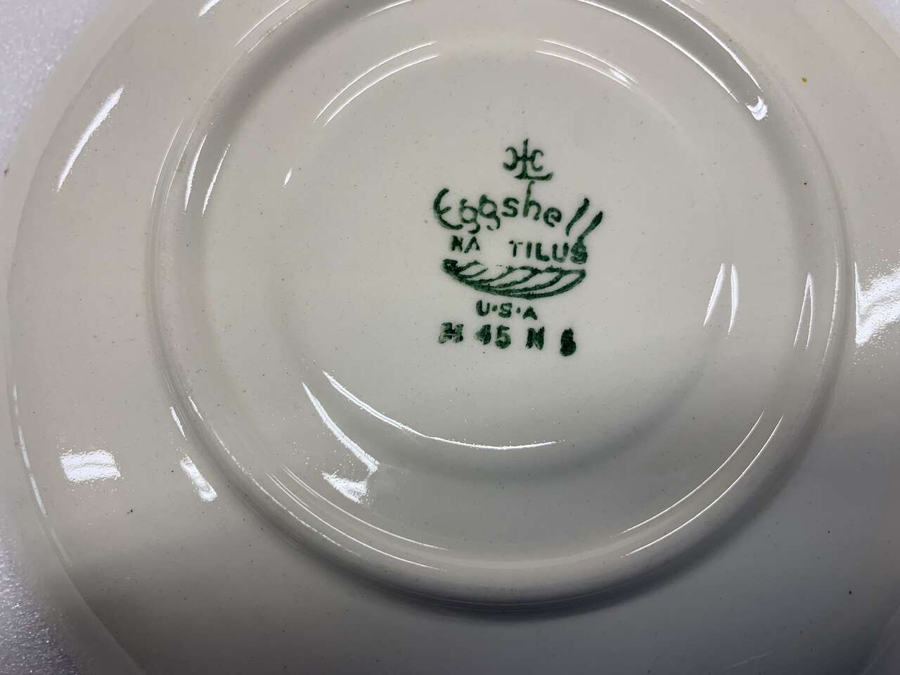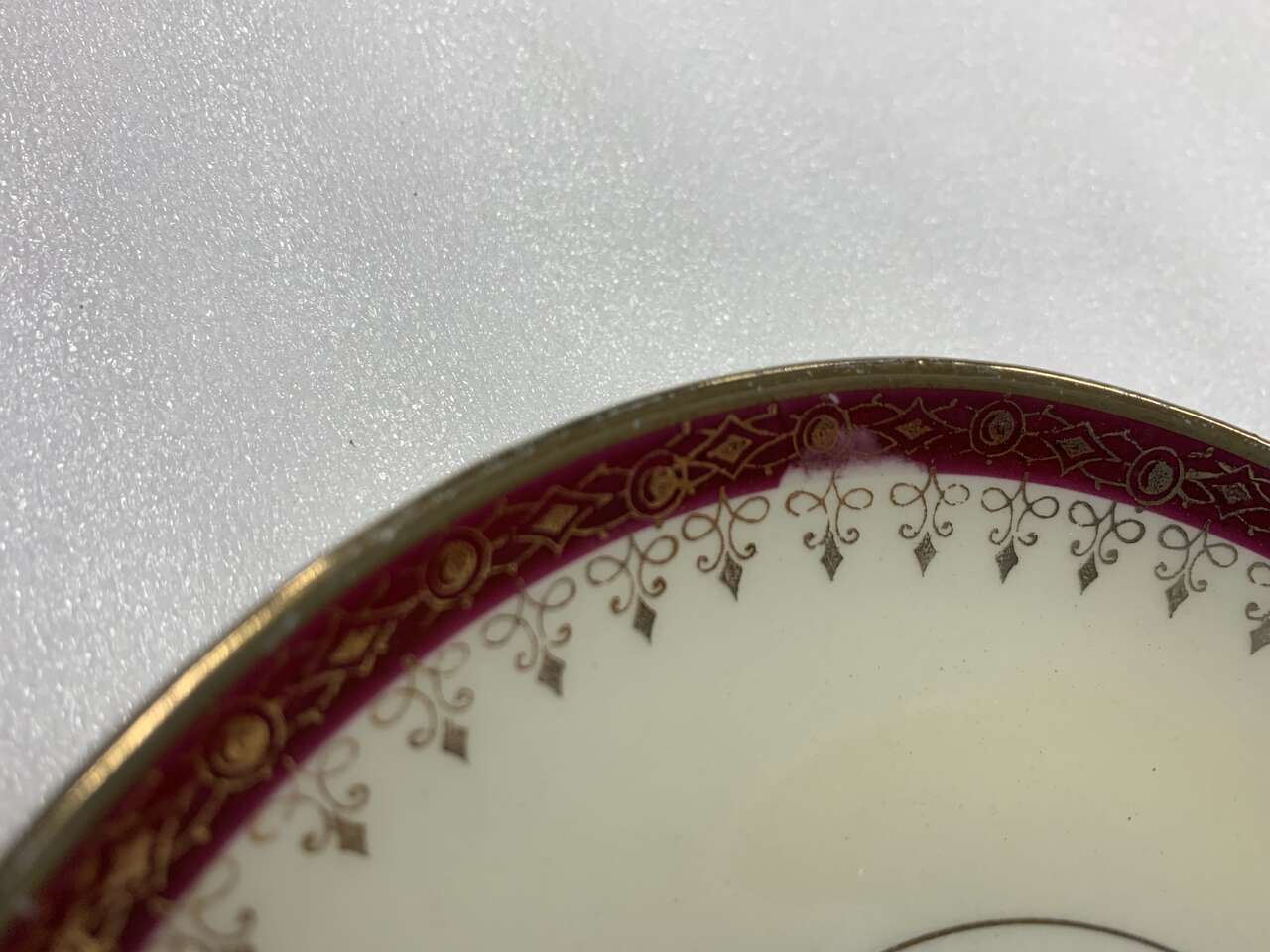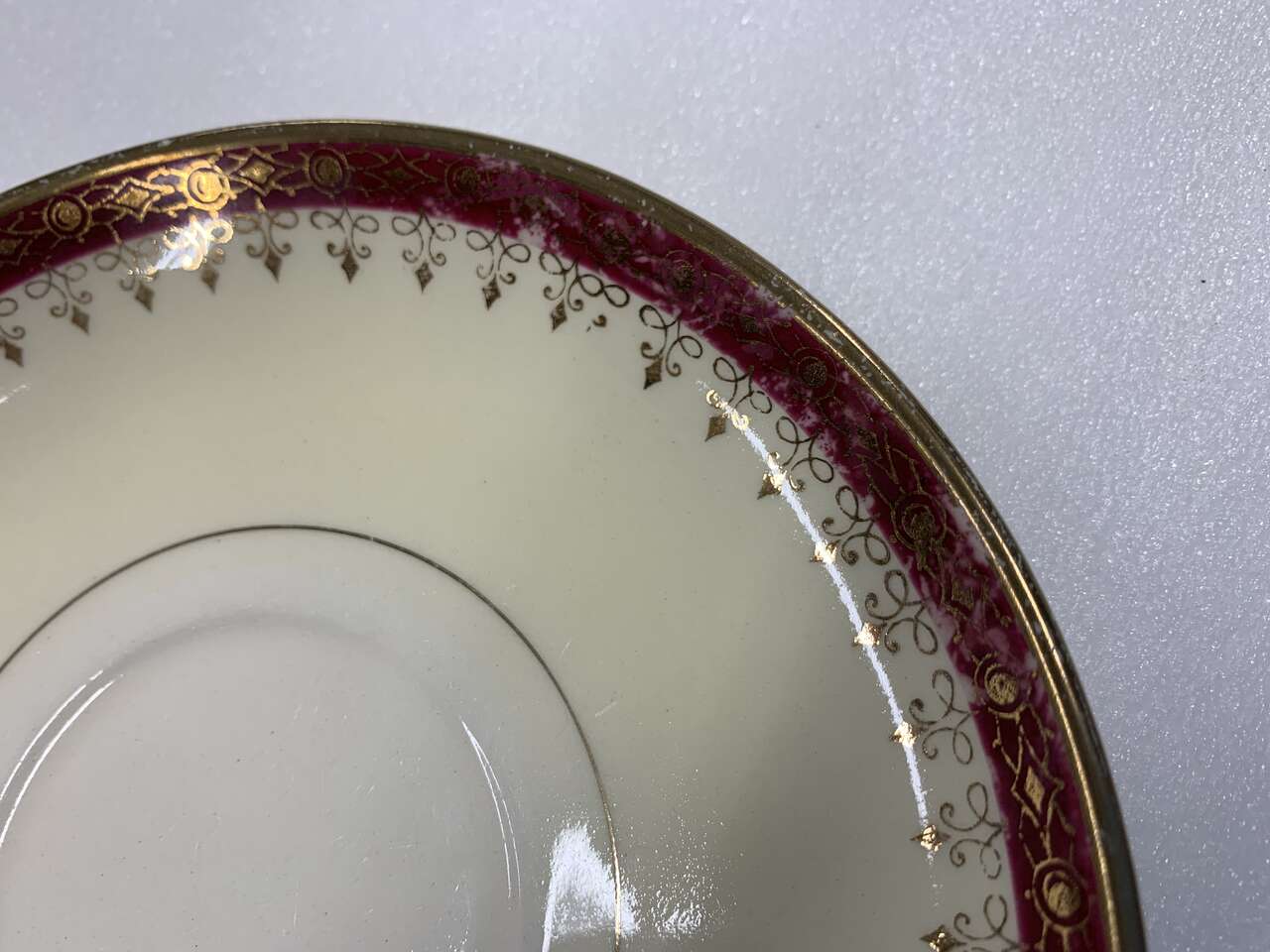 This listing is for a Homer Laughlin saucer, maroon with beautiful ornate Gold trim. Some of the maroon band appears to have been smudged during production. See pics. Eggshell Nautilus mold, made in 1945.