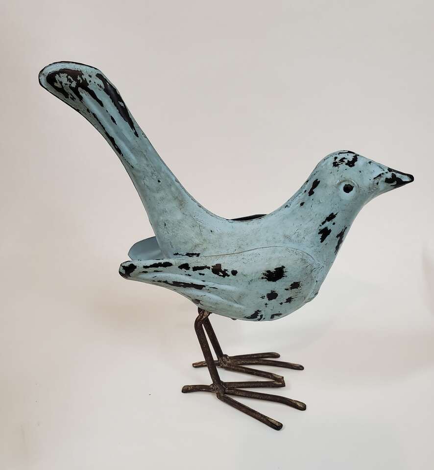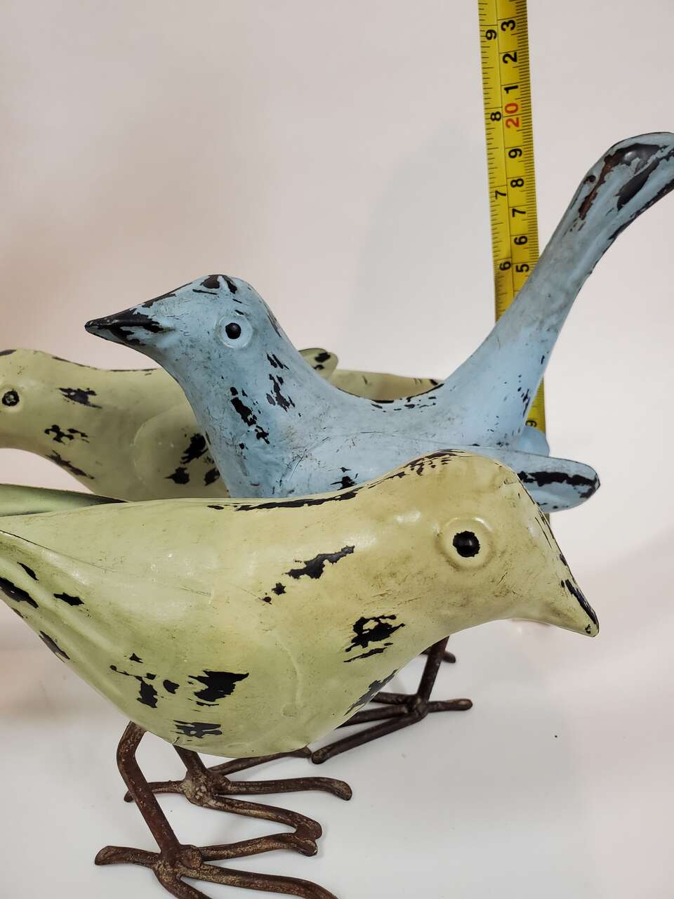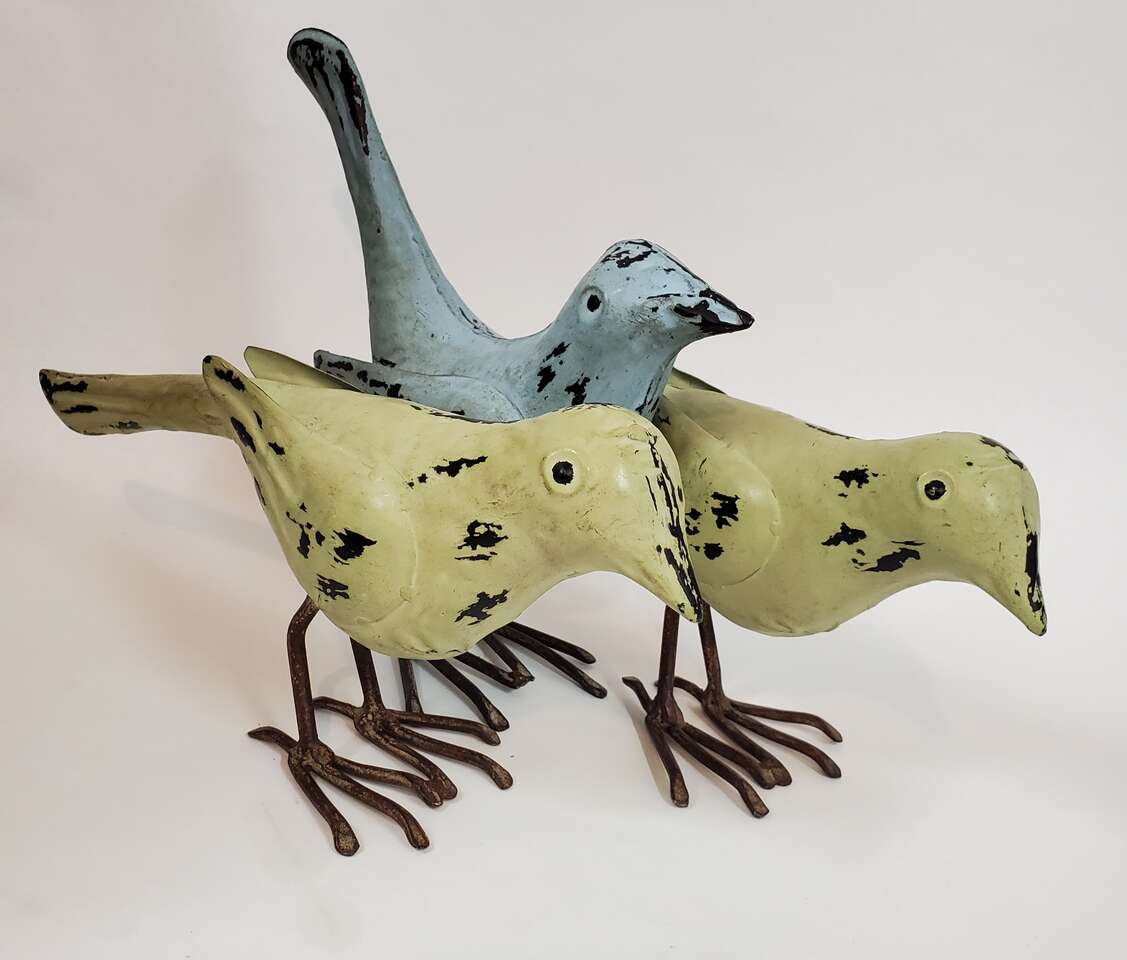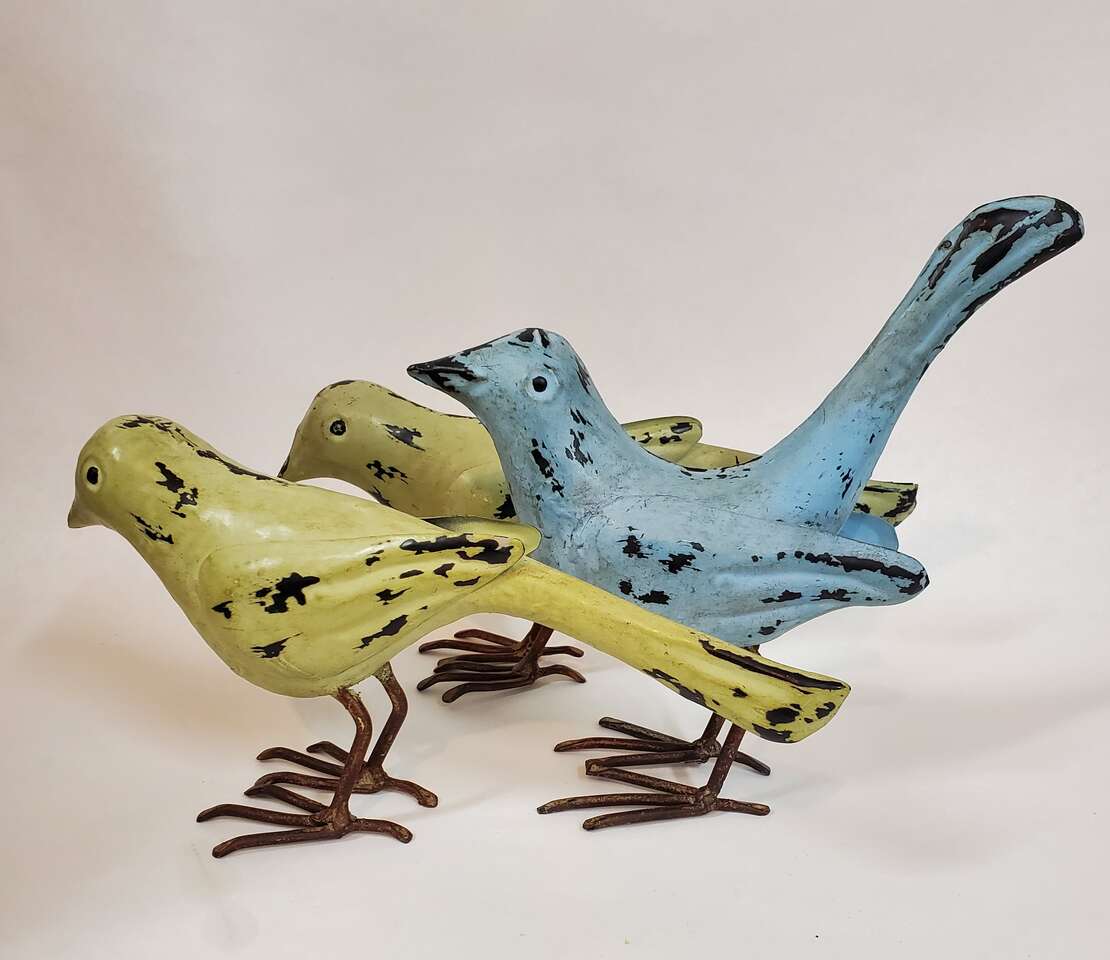 Rustic Metal Bird Sculptures with Pronged Talons and Sculpted Wings. 1 Blue 6" to head 8" X 8" Tail Tip to Talons and 2 Umber Colored 5" X 9". $15.00 each. Cash Only, No Codes