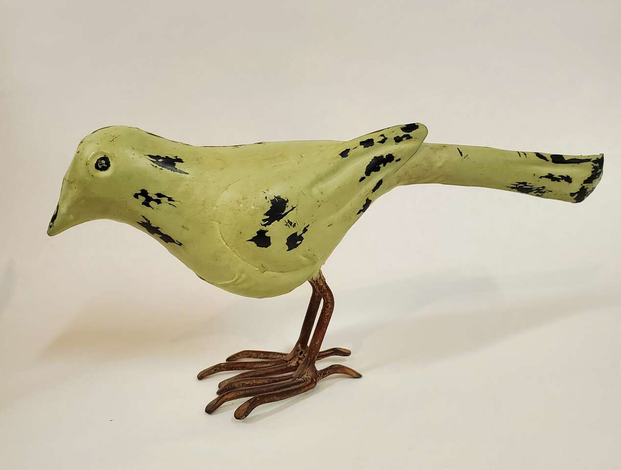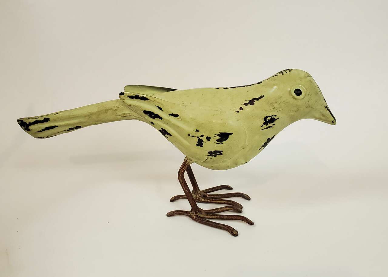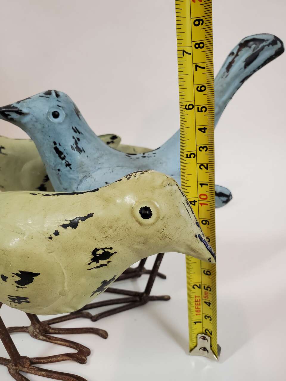 Rustic Metal Bird Sculptures with Pronged Talons and Sculpted Wings. 1 Blue 6" to head 8" X 8" Tail Tip to Talons and 2 Umber Colored 5" X 9". $15.00 each. Cash Only, No Codes