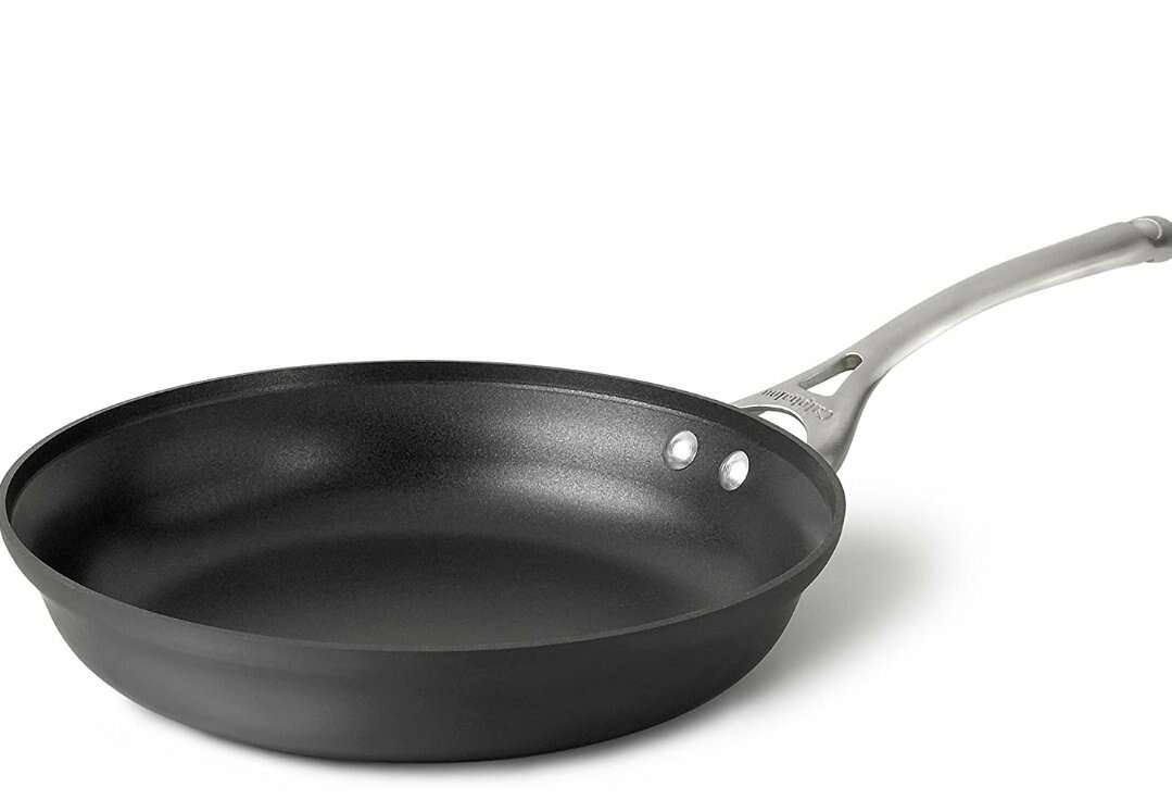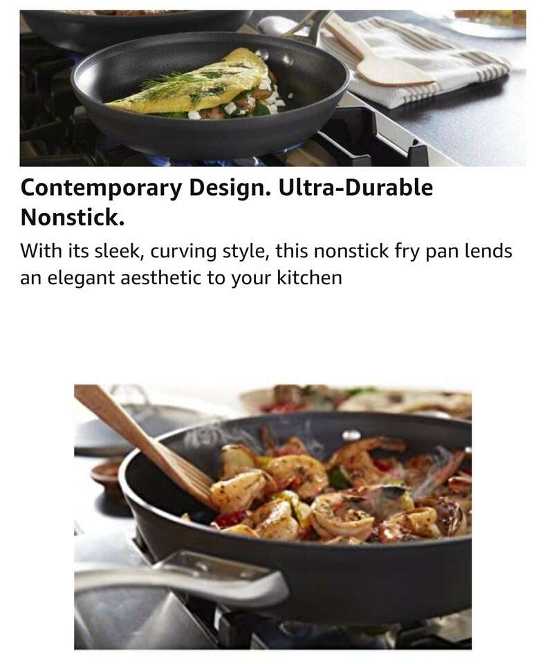The Calphalon Contemporary Nonstick 12-inch Fry Pan features a stylish, modern design that looks great in the kitchen while offering reliable everyday performance. This fry pan has a thick, flat bottom with gently sloping sides, making it ideal for preparing crepes, eggs and omelettes, sautéing vegetables, and browning potatoes. Heavy-gauge, hard-anodized aluminum construction ensures even heating, while a multi-layer nonstick surface offers exceptional durability and easy cleanup. And unlike most hard-anodized cookware, this fry pan is dishwasher-safe. The Calphalon Contemporary Nonstick 12-inch Fry Pan is oven safe to 450 degrees Fahrenheit and backed by a full lifetime warranty.