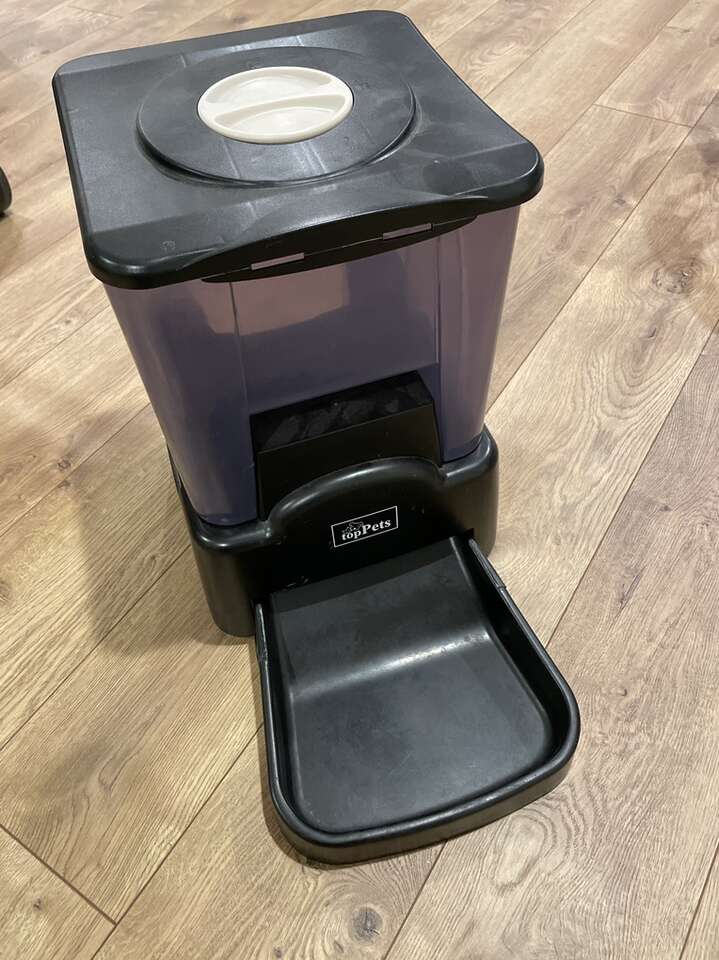 Older auto feeder. Still works fine. Holds about 1.5 gallons with a locking top.