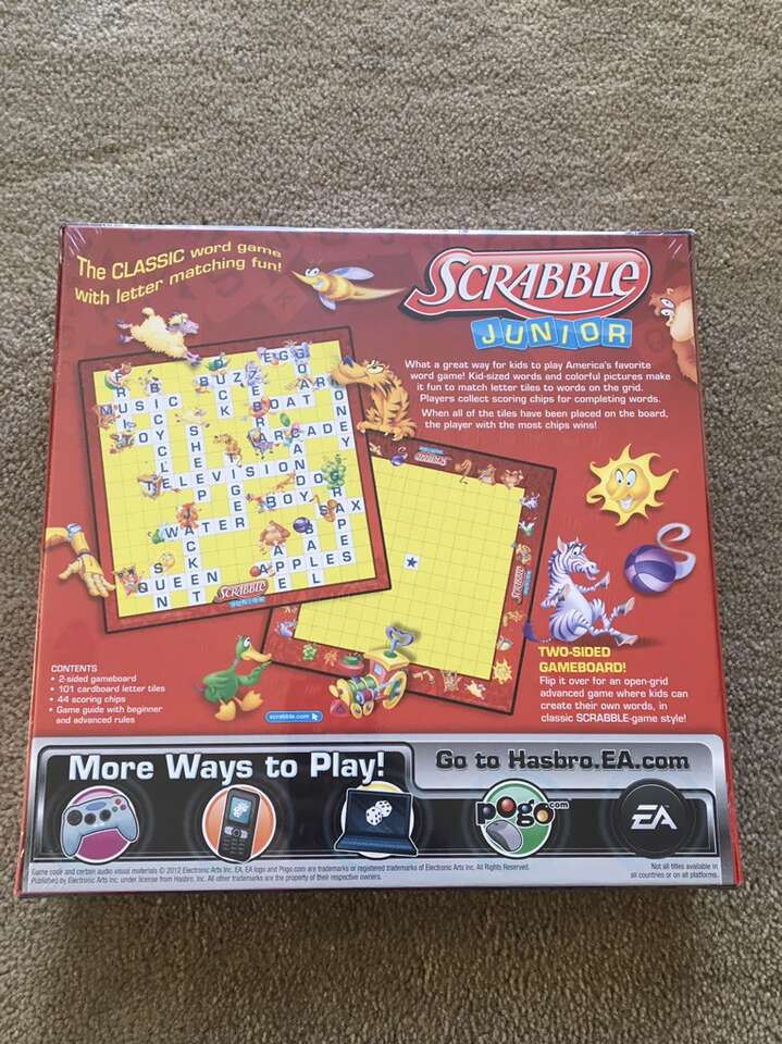 NEW (sealed in plastic) Scrabble Junior: the classic word game with letter matching fun! 2012, 2-4 players, ages 5+. New condition, never opened. Text only. Cash or Venmo.